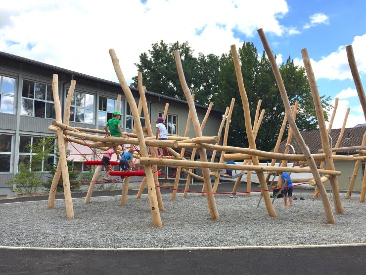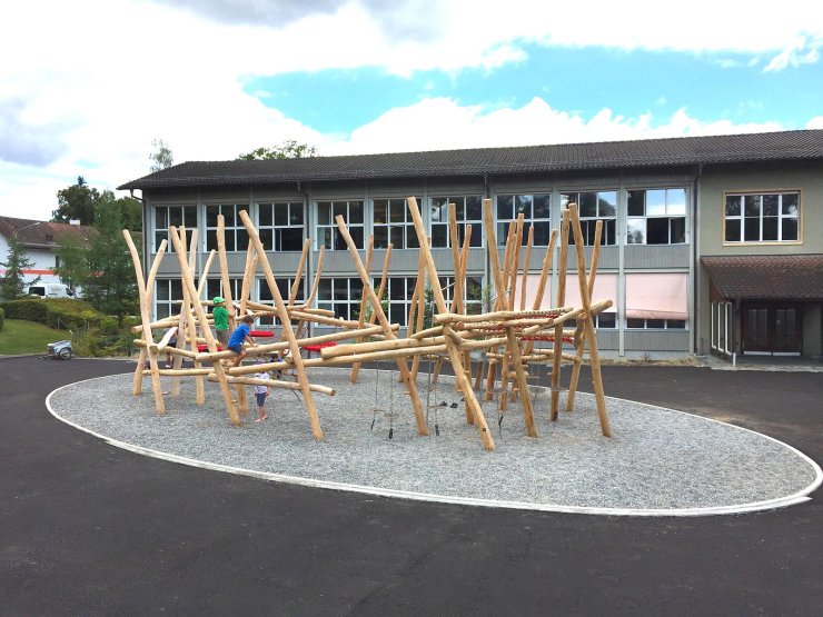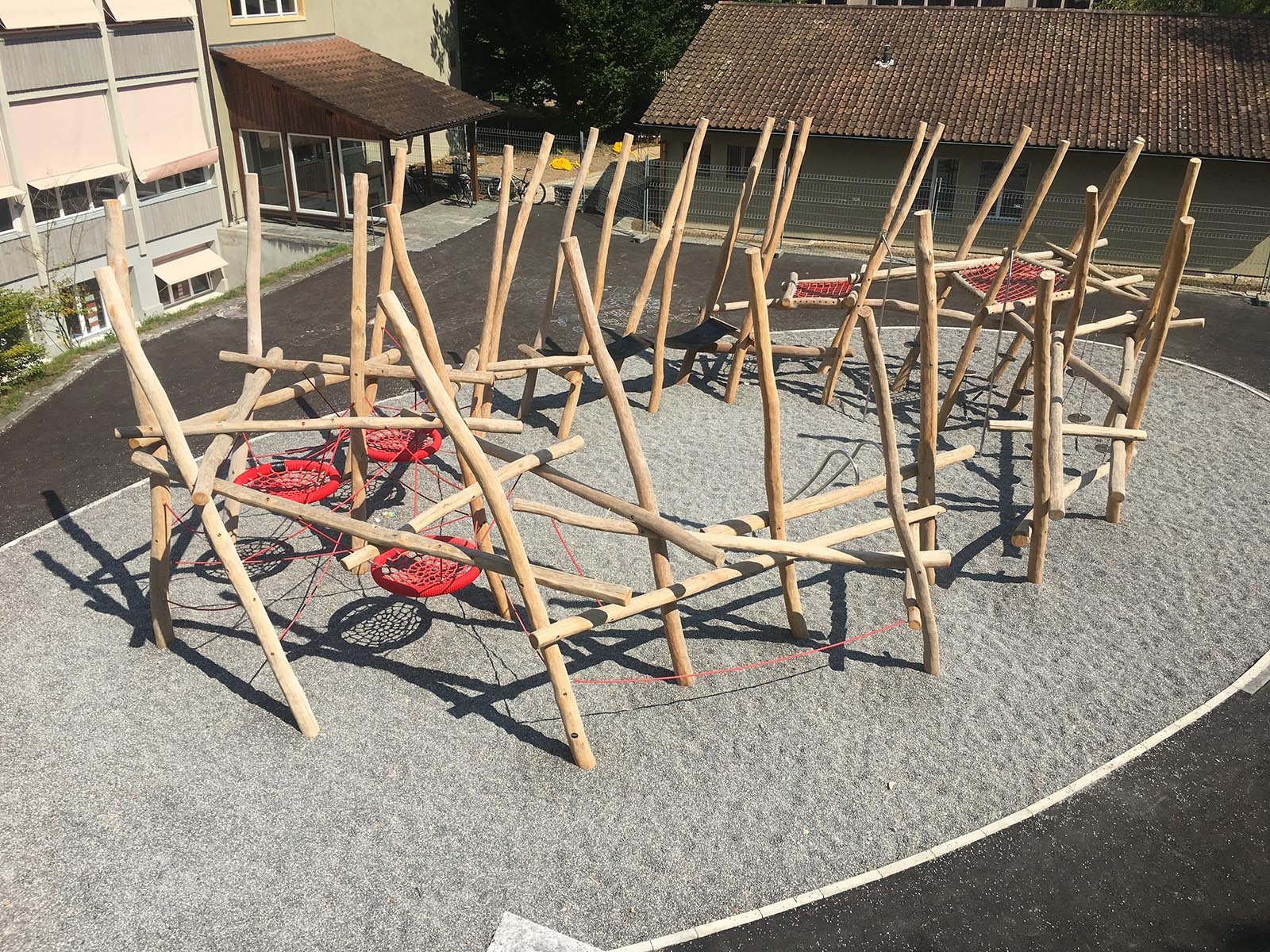 der horizontale teil des geräts bildet einen kletterparcours und schwingt sich von der tieferen mitte zu den schmalen seiten auf. von der einfachen trampolinmatte bis zum anspruchsvollen balancierbalken auf zweienhalb metern, für jedes kind der primarschule findet sich eine herausfordernde stelle und wichtig für eine schule: es hat für viele kinder miteinander platz - die pausen sind kurz und die schüler wollen sich alle bewegen. auf den eingespannten netzen können ältere kinder auch nur liegen und zuschauen und dann elegant über die ruschstangen ins innere des ovals abgleiten. ergänzt wird das spielgerät durch eine hohe schaukel und eine nestschaukel.