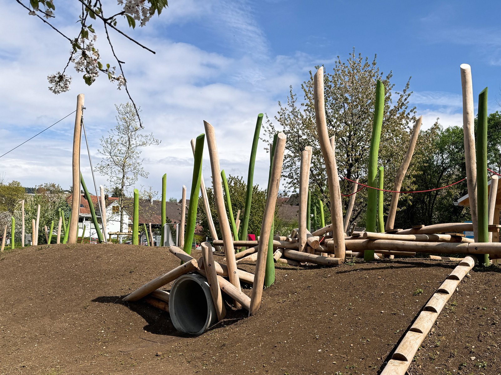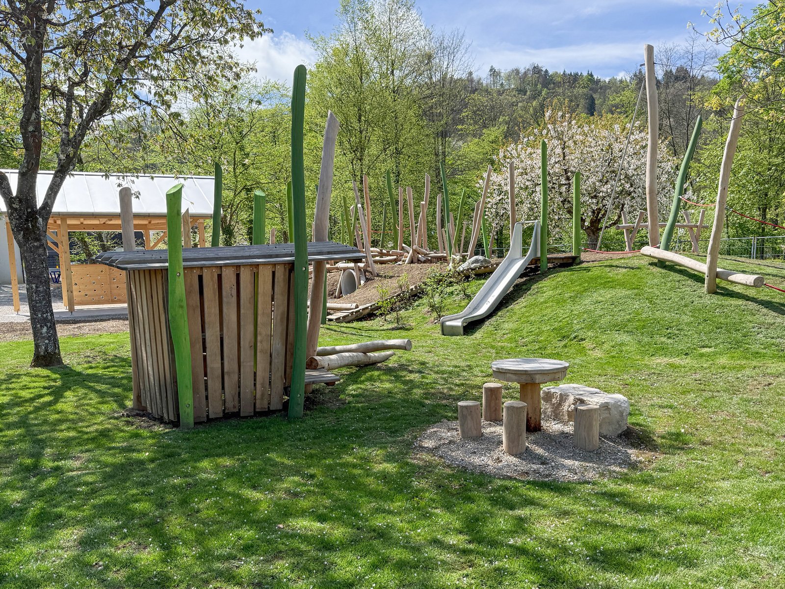 In der grosszügigen Anlage wurde so viel Spielwert wie möglich integriert. Die gesamte Spielanlage ist als grosser Parcours angelegt, der die Kinder dazu animiert, sich hindurchzubewegen und alles zu erkunden.