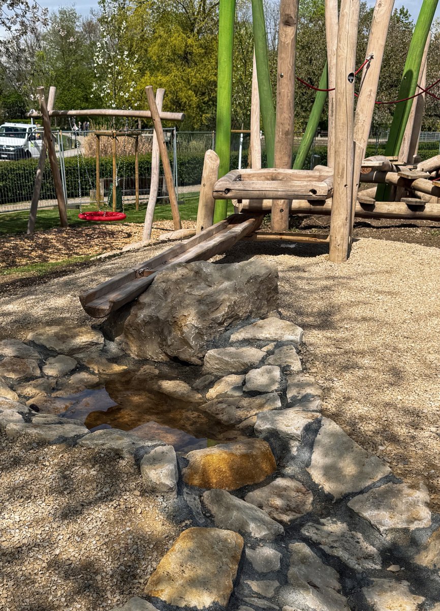 Ergänzt wird das Angebot durch eine schnelle Seilbahn, ein Wasserspiel mit Staumöglichkeiten, kleine Spielhäuschen für Rollenspiele sowie eine Schaukel.