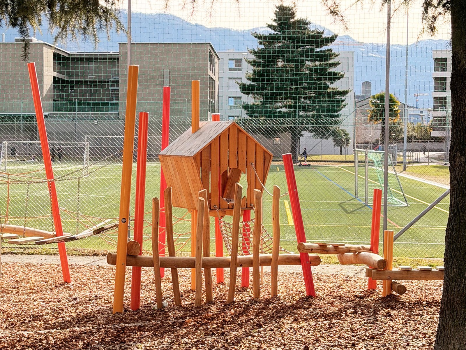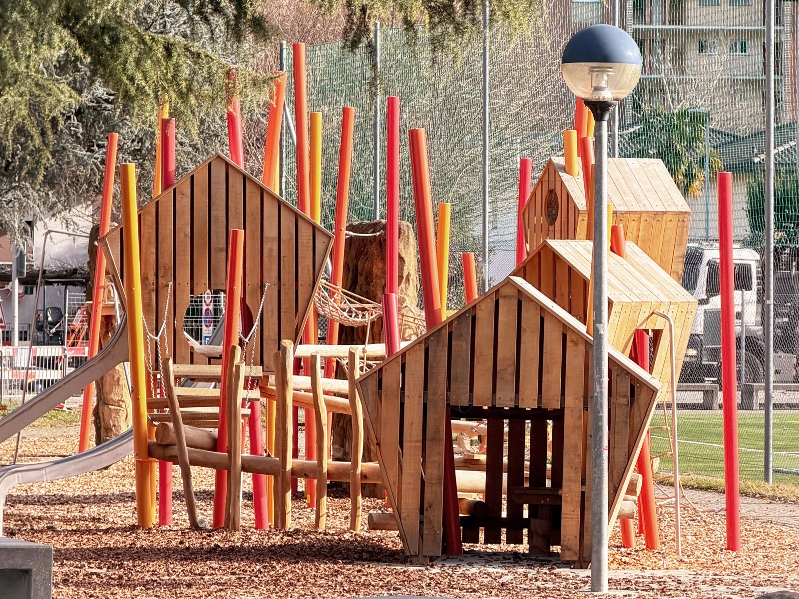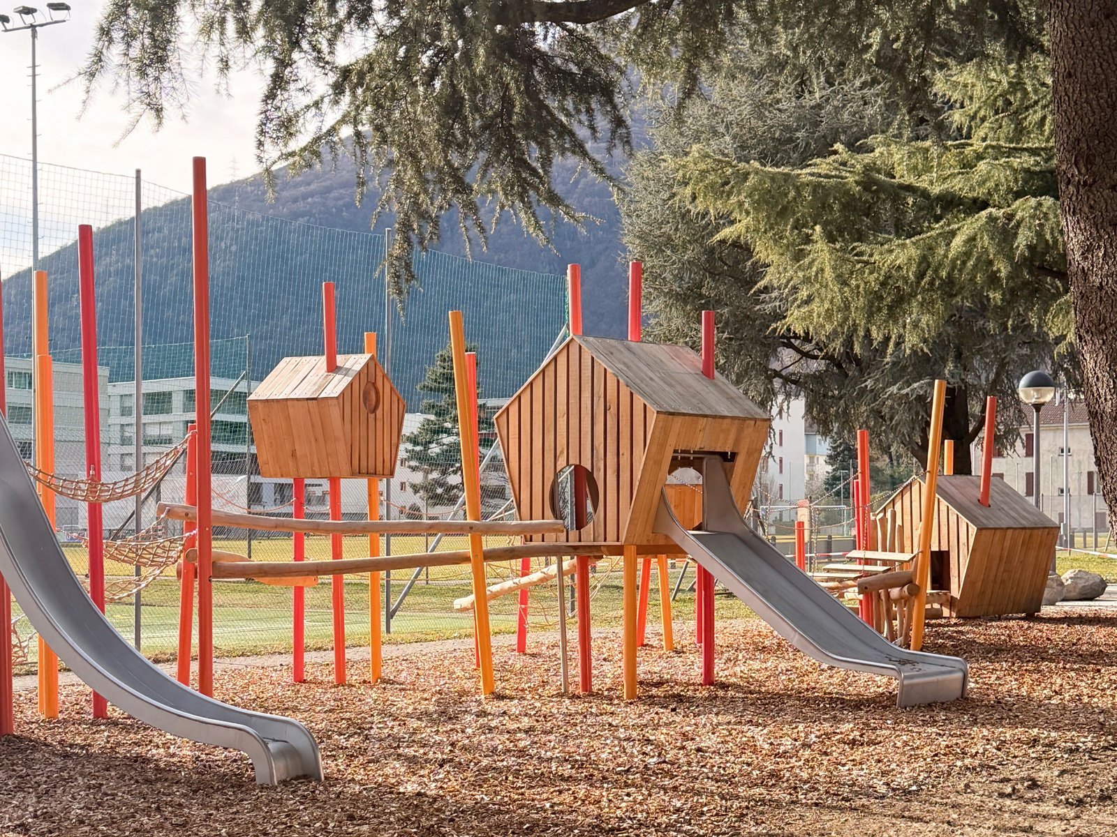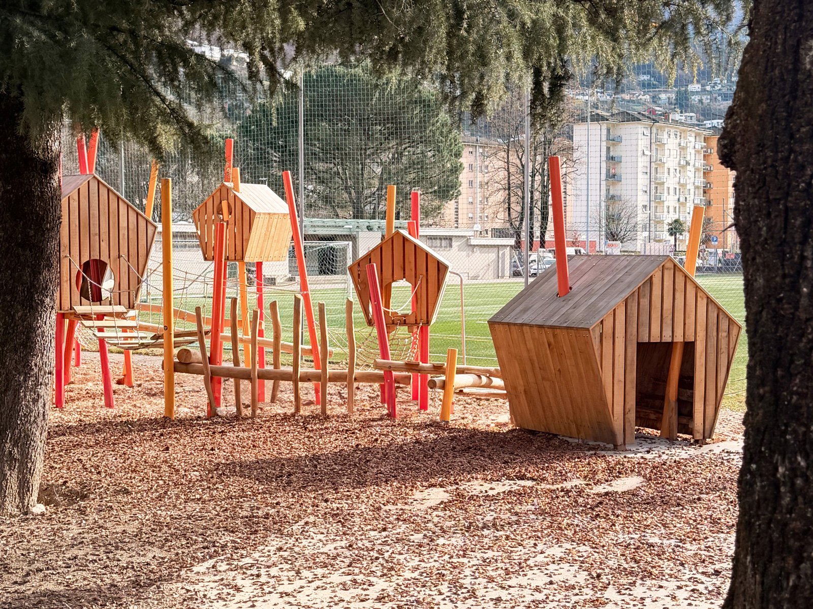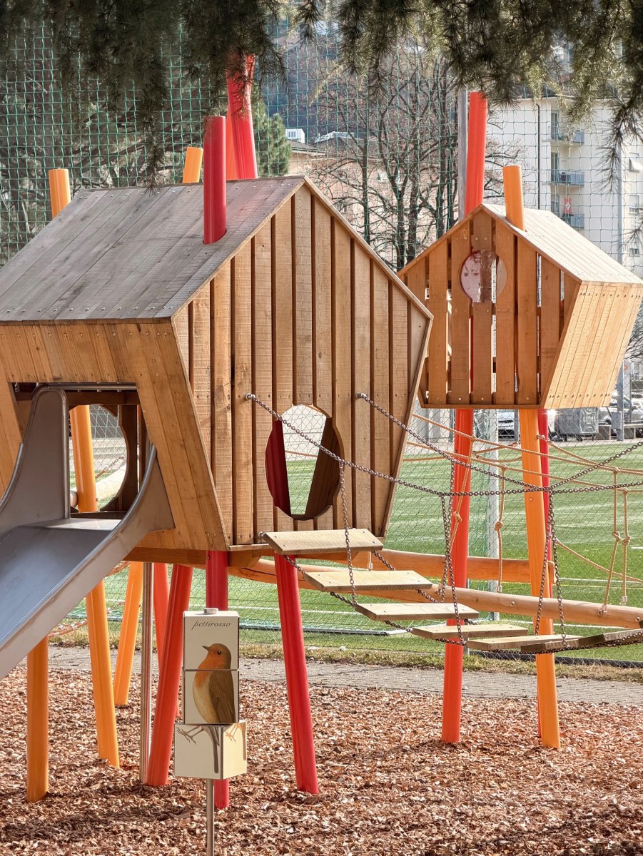 Entstanden ist ein Spielplatz zum Thema „Vogelhüsli“. Prägend sind die Stahlstützen in verschiedenen Rottönen, die einen markanten Kontrast zur grünen Umgebung und zu den holzigen Spielhäusern bilden. Die kräftige Farbigkeit verleiht der Anlage eine lebendige Ausstrahlung und einen hohen Wiedererkennungswert.