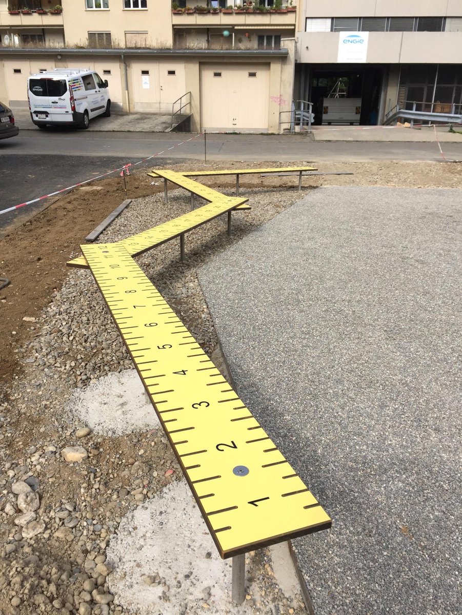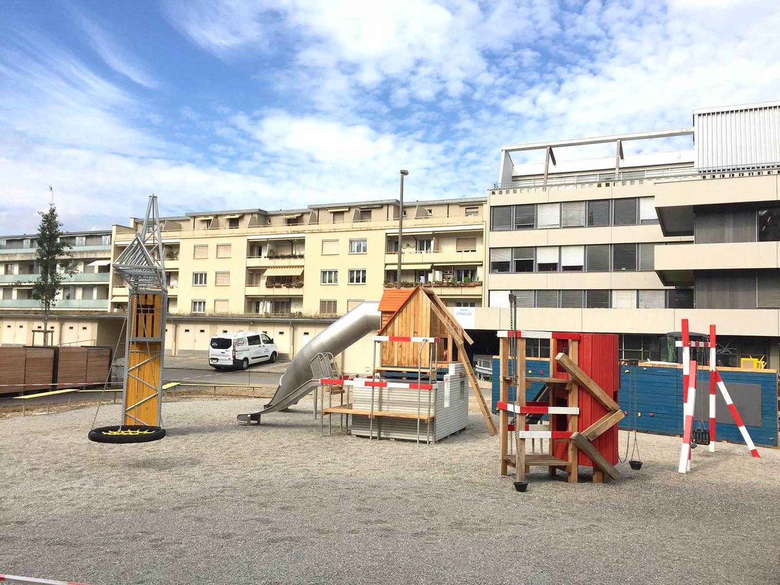 auf dem ehemaligen werkareal der baufirma stamm ag in binnigen entwickelte burckhardt & partner aus basel zwei siedlungen. die gemeinde verlangte von den arealüberbauern einen individuellen spielplatz, der von den bauherrren erstellt und dann an die gemeinde übergeben wird und somit auch öffentlich genutz werden darf. als thema wurde eine baustelle vorgegeben. auf dieser spielbaustelle steht das haus, das im bau ist, im zentrum. aus dem oberen stockwerk führt eine röhrenrutsche geschwungen in die tiefe. der seitliche anbau ist noch im bau und hat ein gerüst. ein gelber turmdrehkran dient als aufhängung für eine einpunktschaukel und bildet den zweiten markanten punkt. ein betonsilo mit förderband, eine mulde, eine wasserwaage, die eine wippe ist, und eine doppelschaukel ergänzen den spielplatz. als sichtschutz gegen die strasse dient eine bauwand mit wandtafel auf der innenseite.