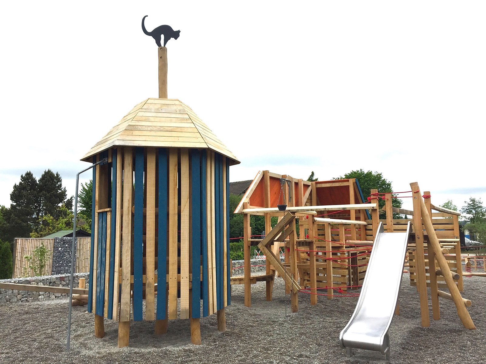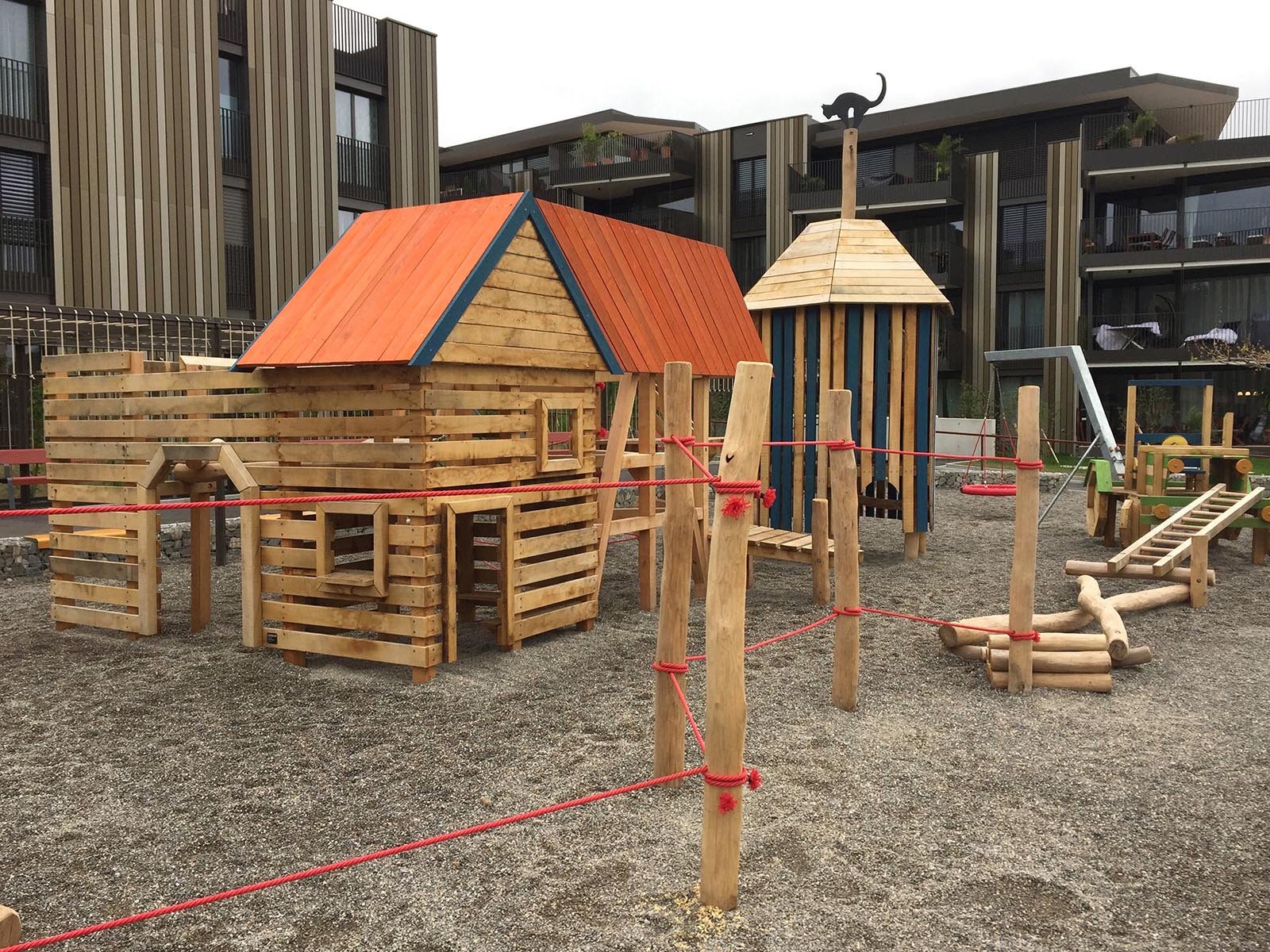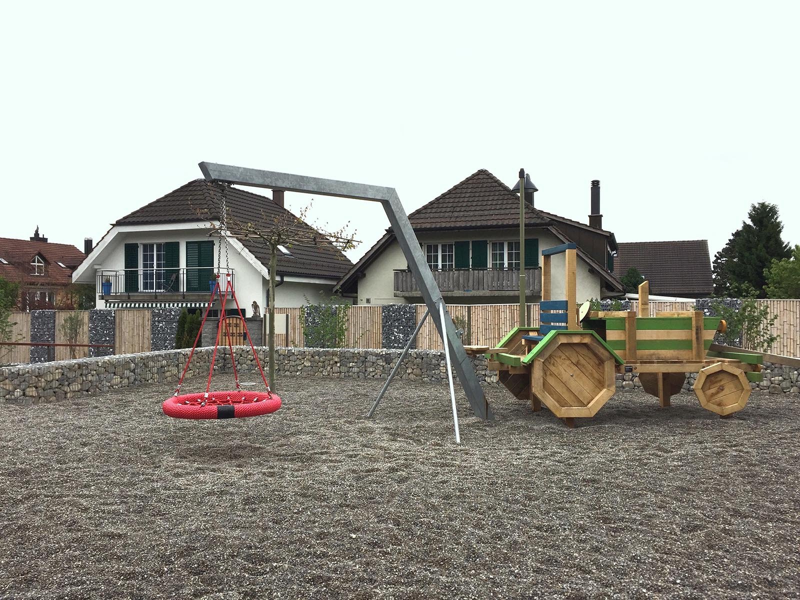 bei dieser neuen siedlung in dietlikon durften wir ein bauernhof als thematischen & fabigen spielplatz bauen. zentral liegt das bauernhaus mit scheune. im inneren ein hüsli, und im scheunenbereich und im obern stock verschiedene klettermöglichkeiten und einer rutsche. neben dem stall: der futtersilo mit katze obendrauf. im inneren kann man in die spitze hoch klettern und dann mit der feuerwehrstange aussen runter rutschen. nebenan steht der traktor mit dem mistkran, der eine einpunktschaukel ist. vom traktor klettert man über eine leiter und ein zaun bis zum kleintiergehege, dessen einzäunung ein kletterparcours für kleinere kinder ist.