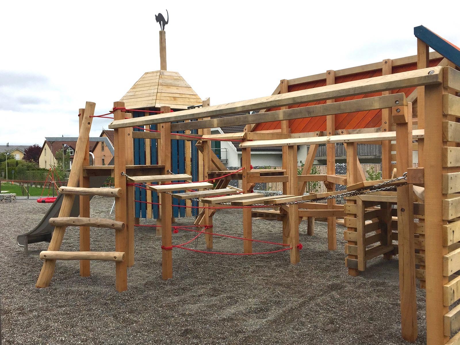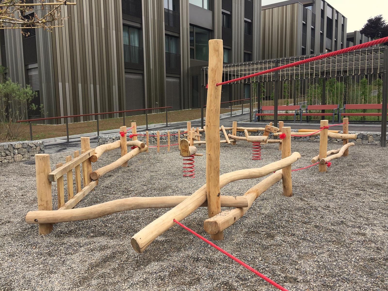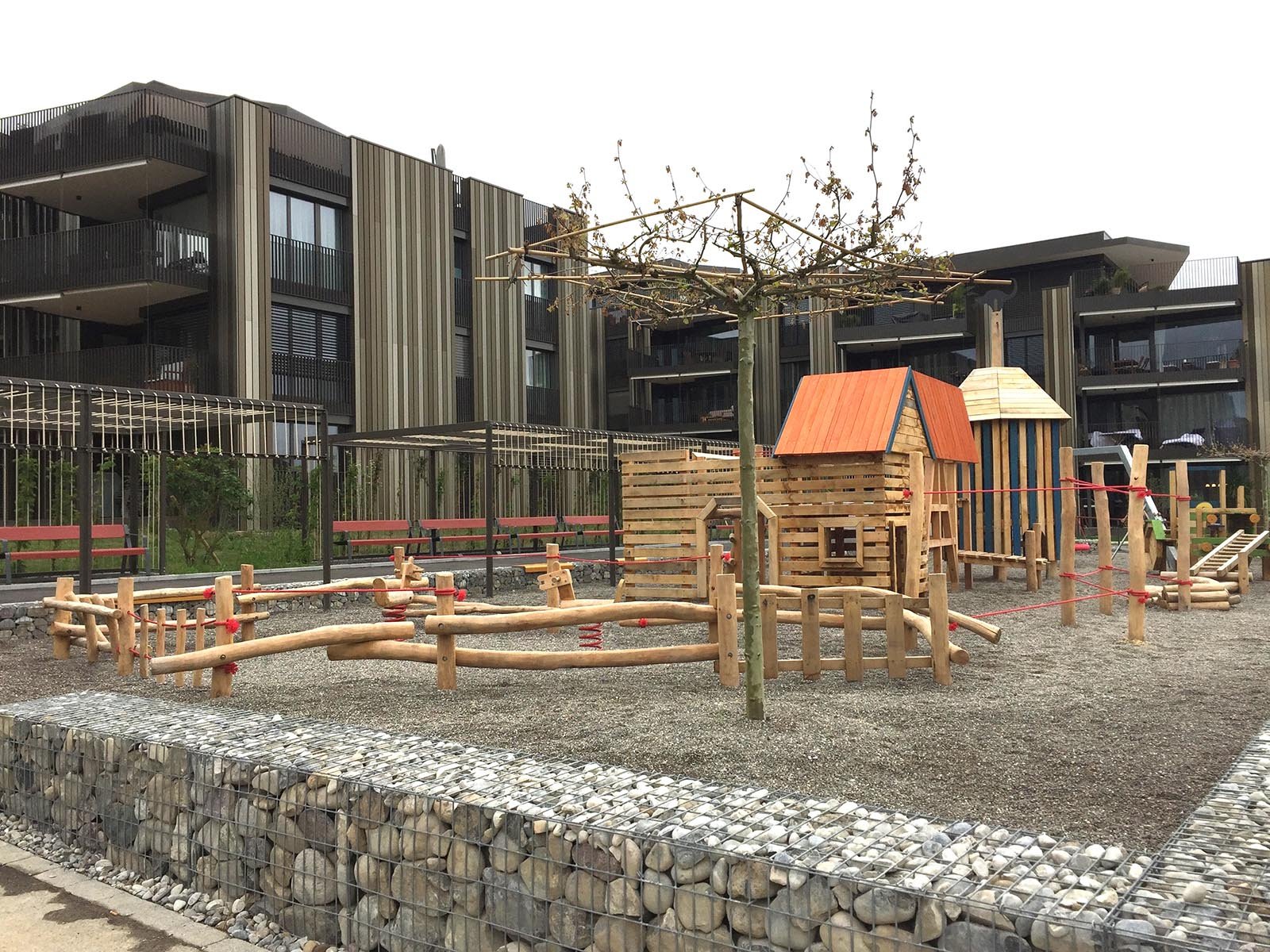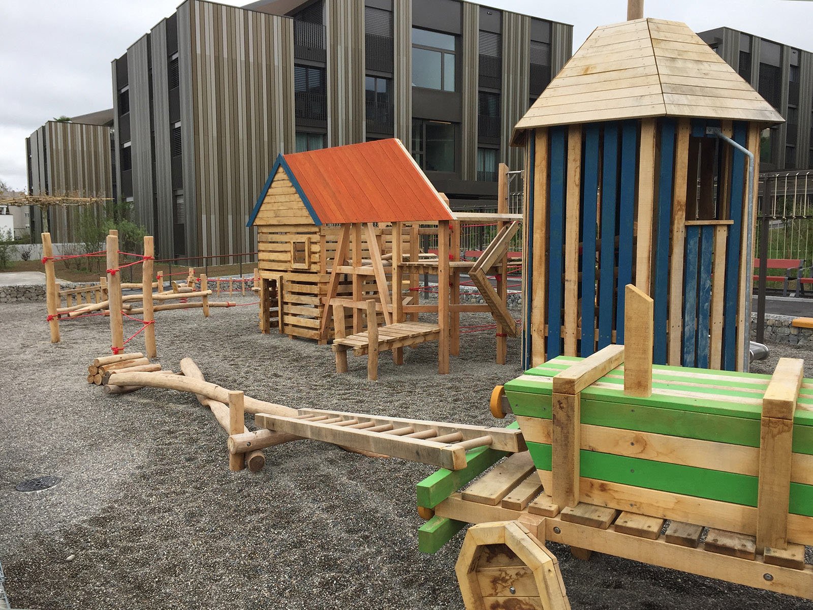 bei dieser neuen siedlung in dietlikon durften wir ein bauernhof als thematischen & fabigen spielplatz bauen. zentral liegt das bauernhaus mit scheune. im inneren ein hüsli, und im scheunenbereich und im obern stock verschiedene klettermöglichkeiten und einer rutsche. neben dem stall: der futtersilo mit katze obendrauf. im inneren kann man in die spitze hoch klettern und dann mit der feuerwehrstange aussen runter rutschen. nebenan steht der traktor mit dem mistkran, der eine einpunktschaukel ist. vom traktor klettert man über eine leiter und ein zaun bis zum kleintiergehege, dessen einzäunung ein kletterparcours für kleinere kinder ist.