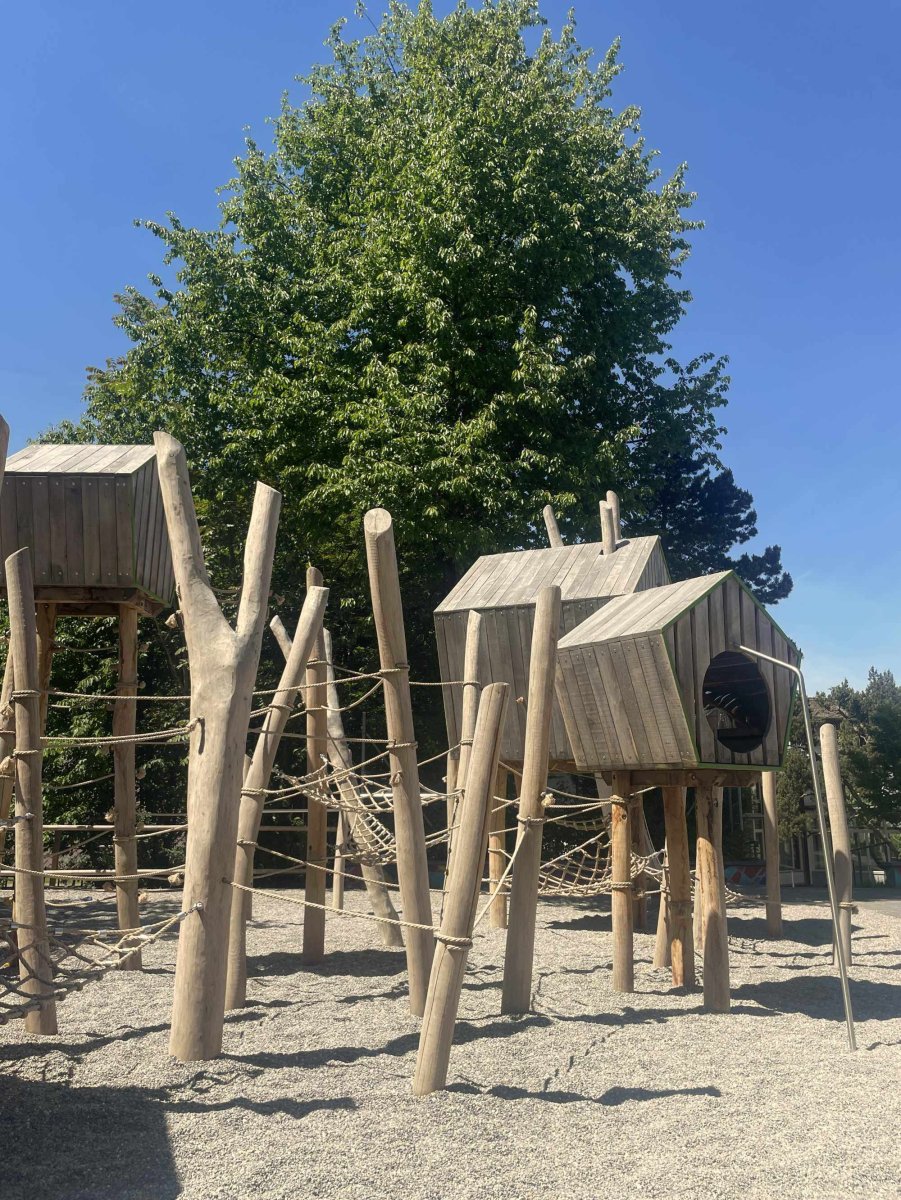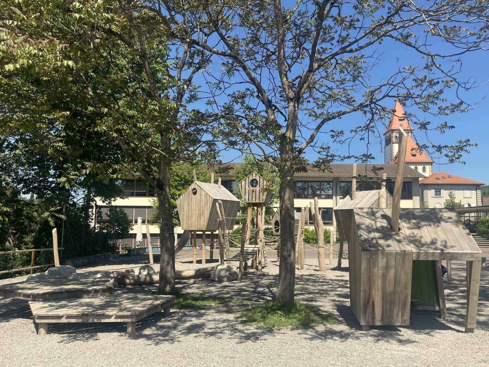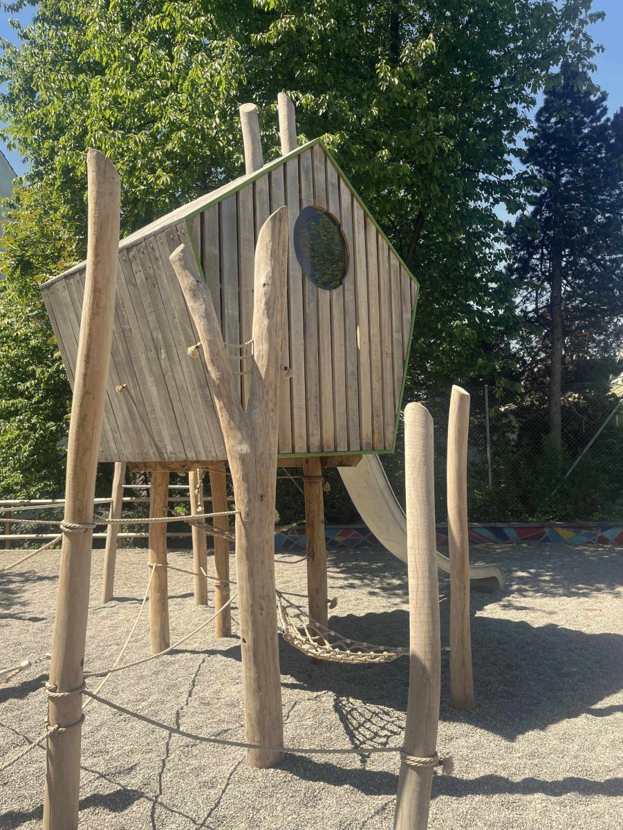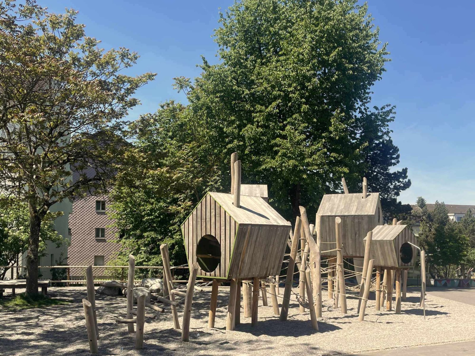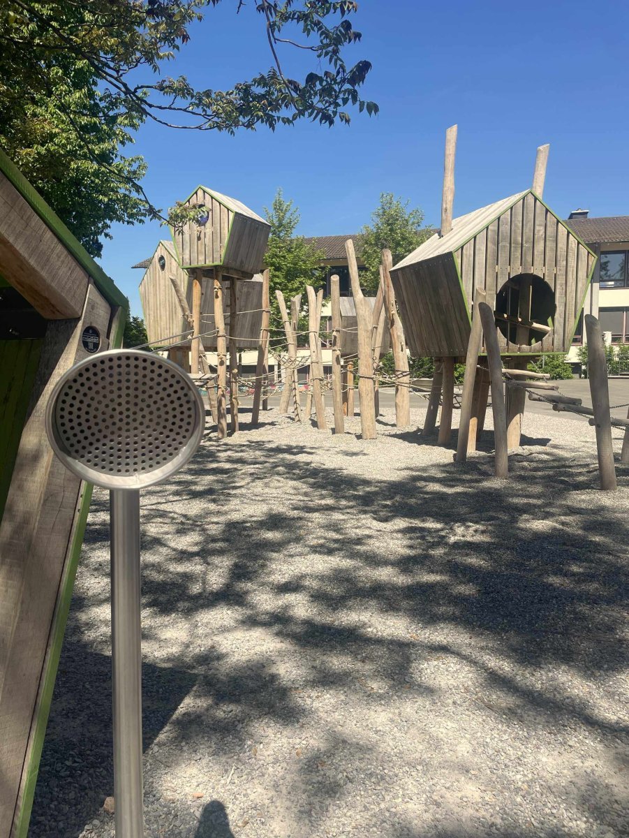 für die neue spielanlage haben wir fünfeckige vogelhüsli mit charakteristischen runden eingängen gestaltet. die vogelhüsli sie sind treffpunkt, rückzugsort, verstecke oder ausgangspunkt für die rutschelemente. ein rollstuhlgäniges Vogelhüsli lädt alle kinder zum mitspielen ein.