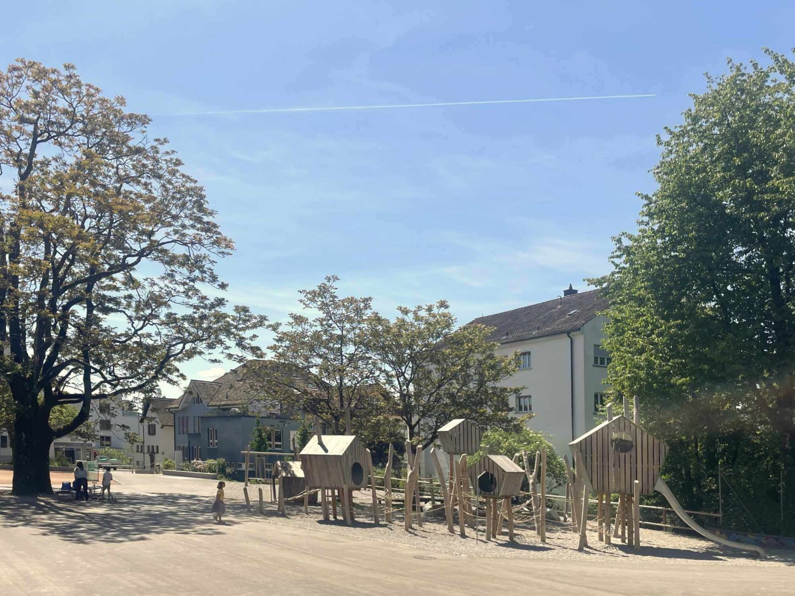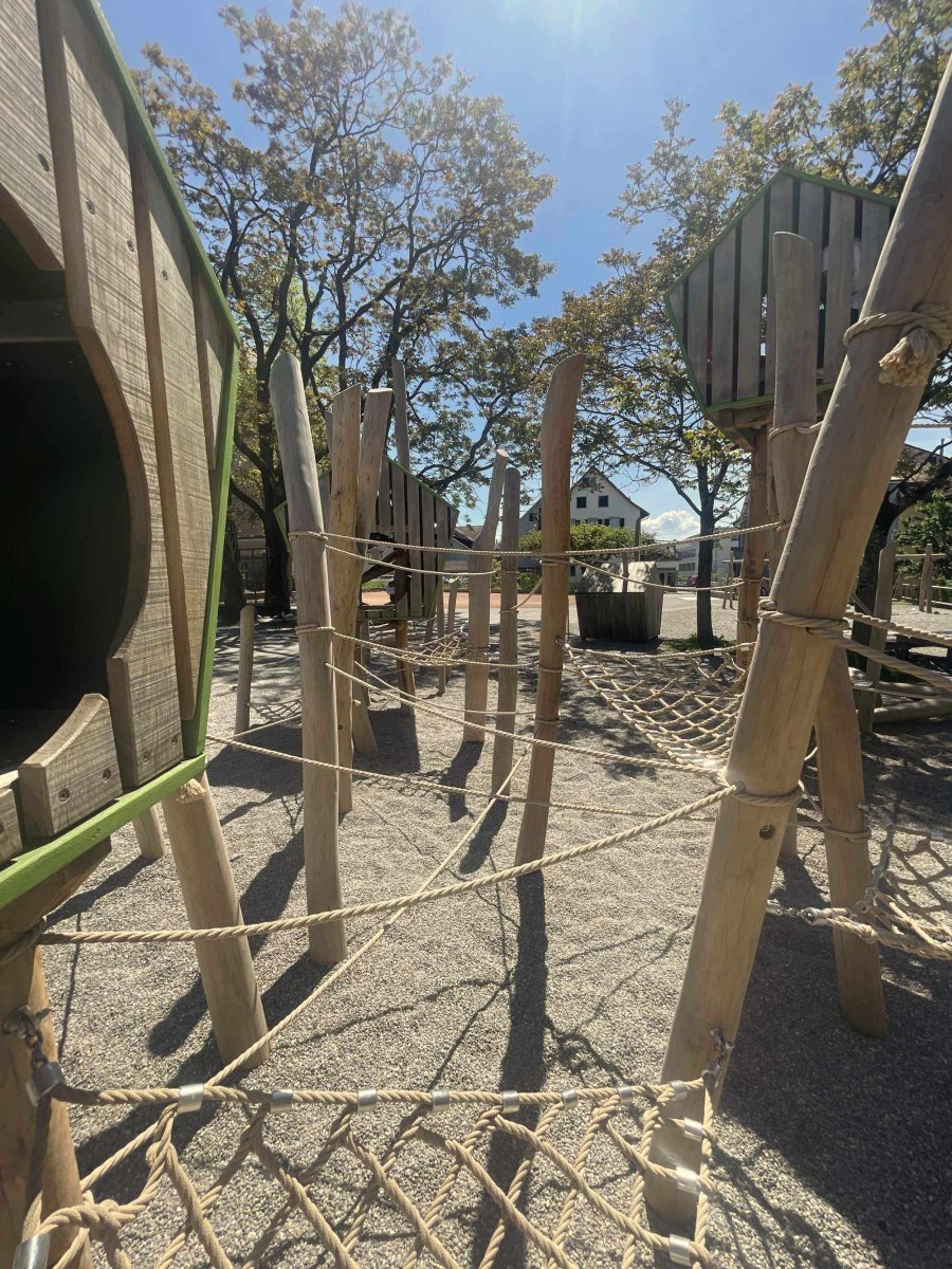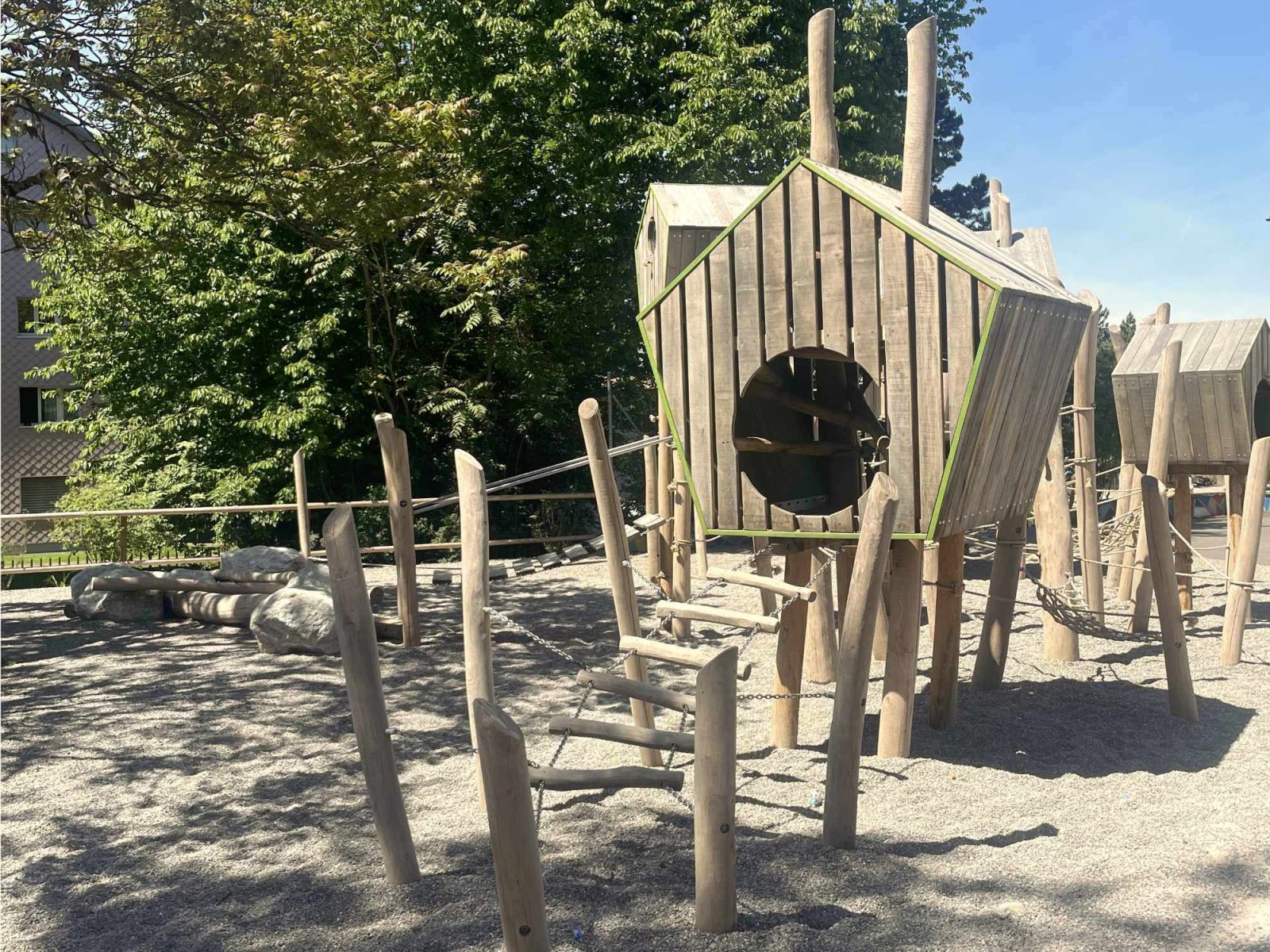 über kletterelemente aus seilen und netzen können die kinder die vogelhüsli erklimmen. die reduktion der kletterelemente auf seile gibt dem spielplatz ein luftiges und leichtes aussehen. auf dem balancierparcours aus liegenden stämmen und einer slackline können die kinder ihr gleichgewicht schulen und an den reckstangen könnnen immer neue turnerische elemente geübt werden. für das dynamische spielerlebnis haben wir einen abwechslungsreichen schaukelbereich und eine grosse drehscheibe geplant. in der mitte des spiefläche laden grossse sitzflächen im schatten der bestehenden bäume zum verweilen und beobachten ein.