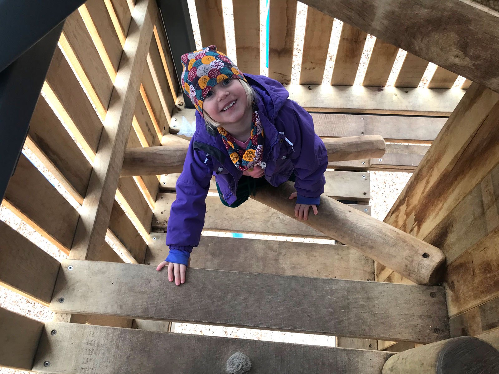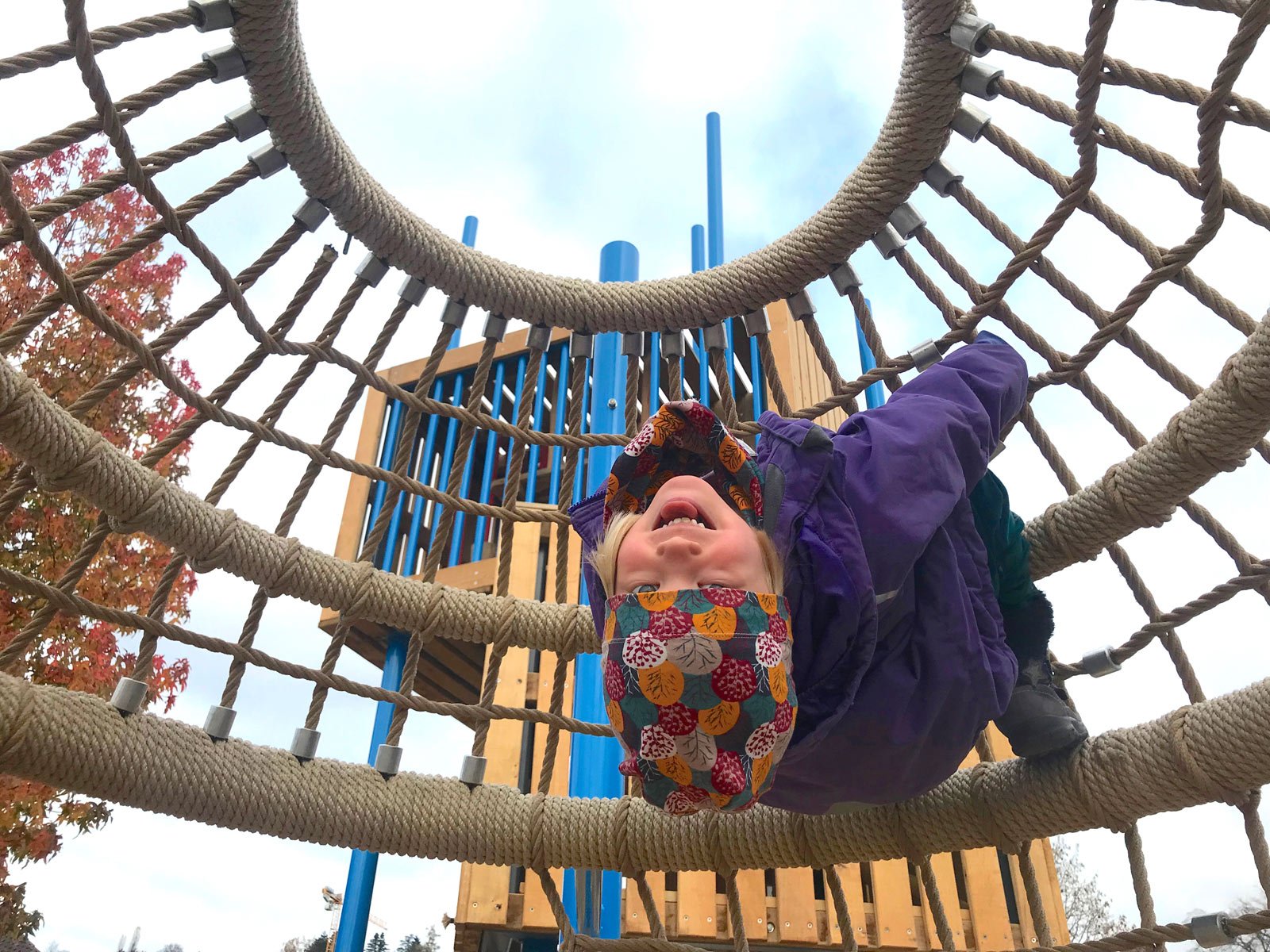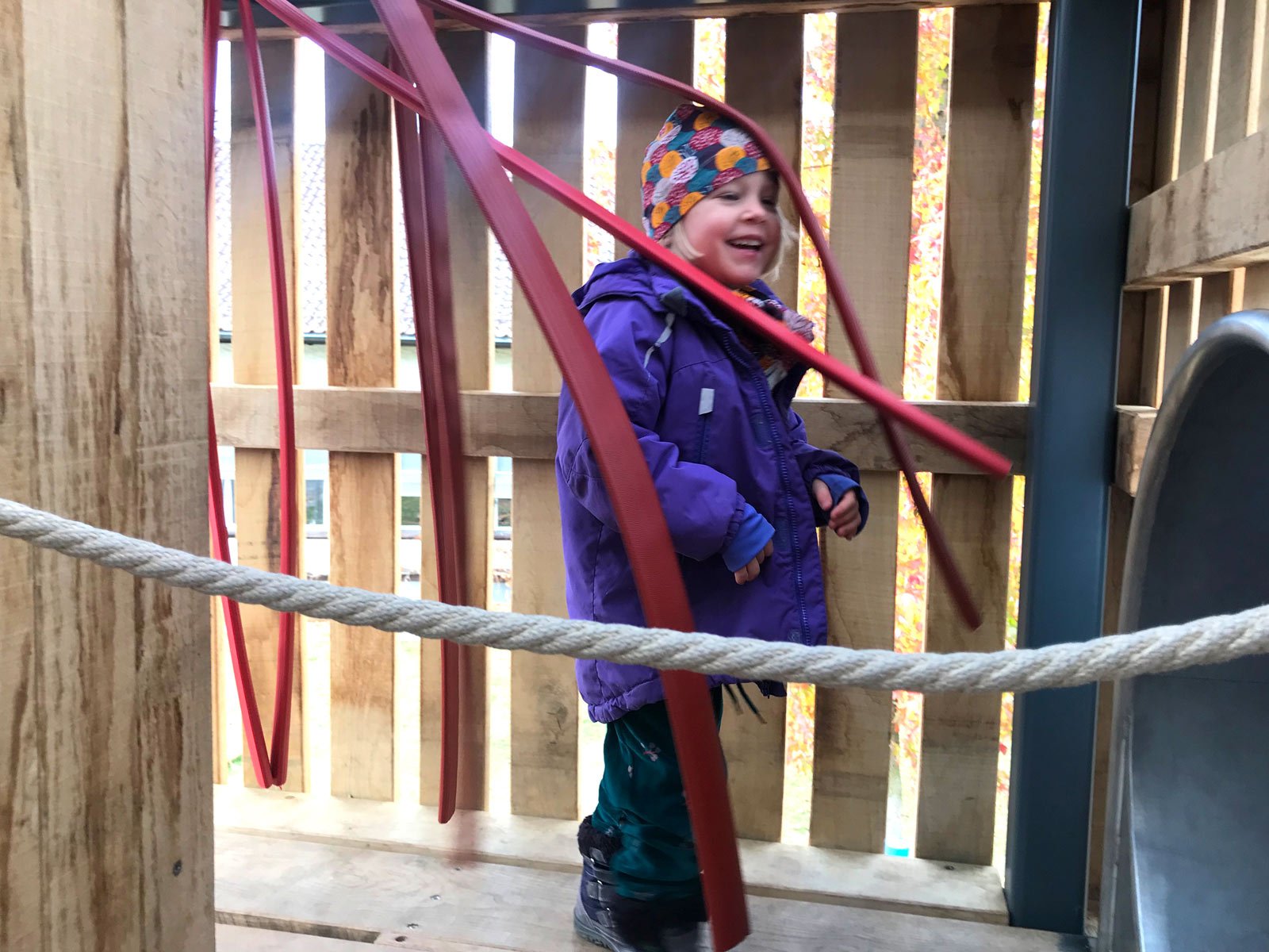 um den im zentrum stehenden, 6 meter hohen turm ist ein luftiger und anspruchsvoller kletterparcours angeordnet. der turm besteht aus zwei zueinander verdrehten holzboxen, die auf filigranen blauen stützen stehen. der innenausbau bietet diverse möglichkeiten wie rollenspiele, aussichtspunkt oder orte, um sich zu verstecken. der aufstieg in die boxen ist mit mehreren netzebenen gelöst, die einfach besteigbar sind. von der obersten box führt eine rasante wendelrutsche in die tiefe. der angeschlossene kletterparcours hat einen abwechslungsreichen spielwert. es gibt diverse herausforderungen wie klettern an den seilen, turnerische elemente an der reckstange und gleichgewichtsübungen auf der slackline oder den balancierstämmen. der über eine strickleiter erreichbare seilkobel ist ein abenteuerlicher treffpunkt. auf der einpunktschaukel können sich die kinder austoben und die fliehkraft erleben.