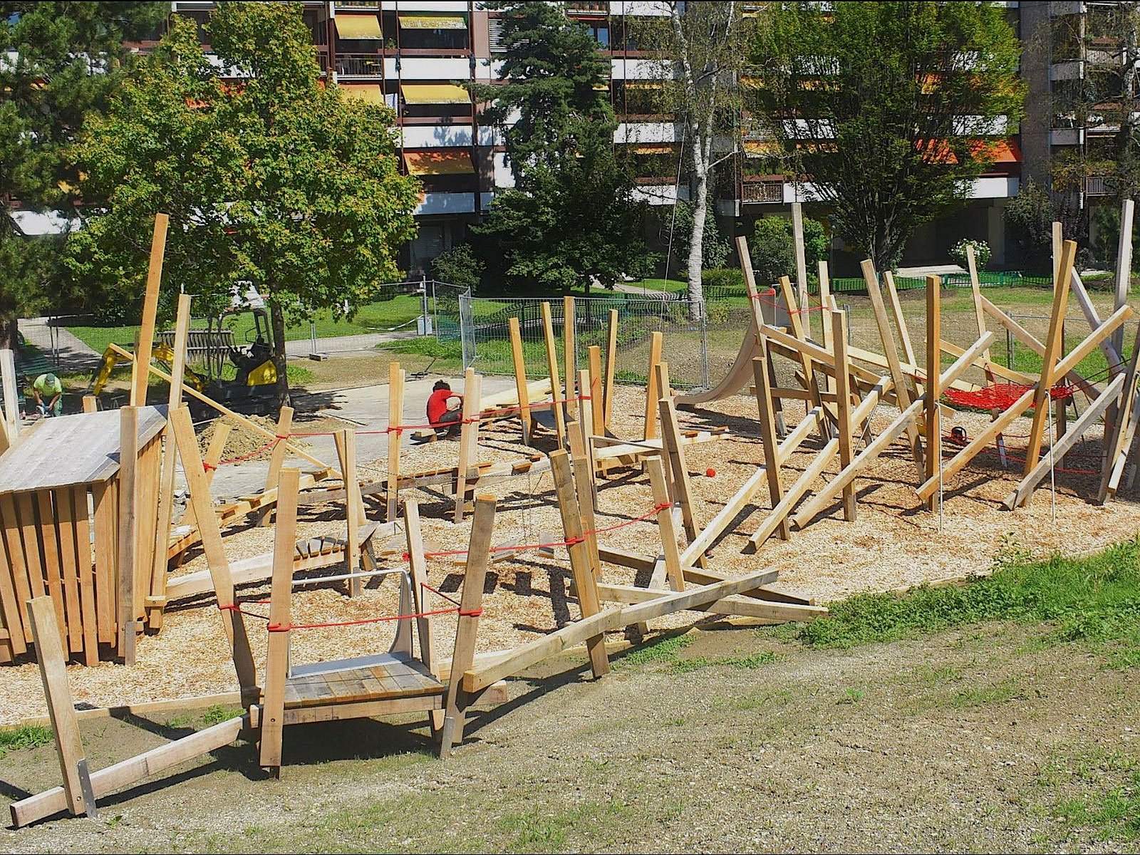 mit unserer gestaltung haben wir passend zu den gebäuden, mit gesägten eichenbalken, einen architektonischen spielplatz realisiert. die balken sind verspielt ineindander verschlungen und mit seilen und spielmöglichkeiten ergänzt.