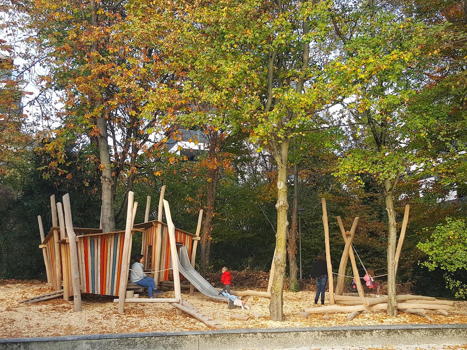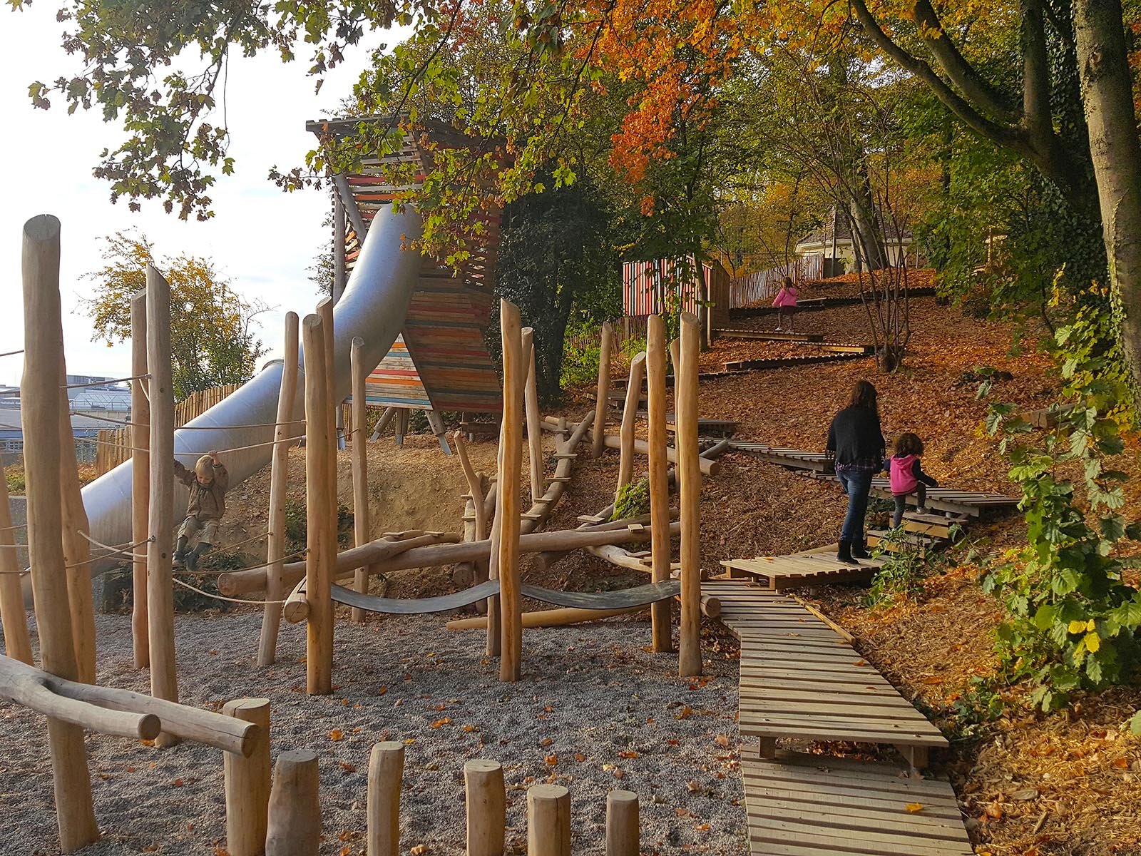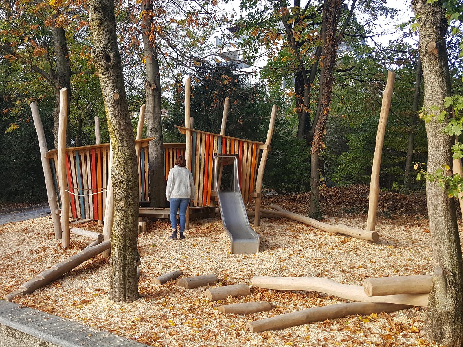 der spielplatz für die kleinen als auch der für die grösseren kinder hat einen waldähnlichen charakter und ist hauptsächlich aus rundholz gebaut. als verbindendes gestalungselement wählten wir eine feine, teilweise farbige lattung, die sowohl beim rutschahnturm wie auch bei den hütten der kleinkinder und in der belattung der podeste des waldweges einen akzent setzt.