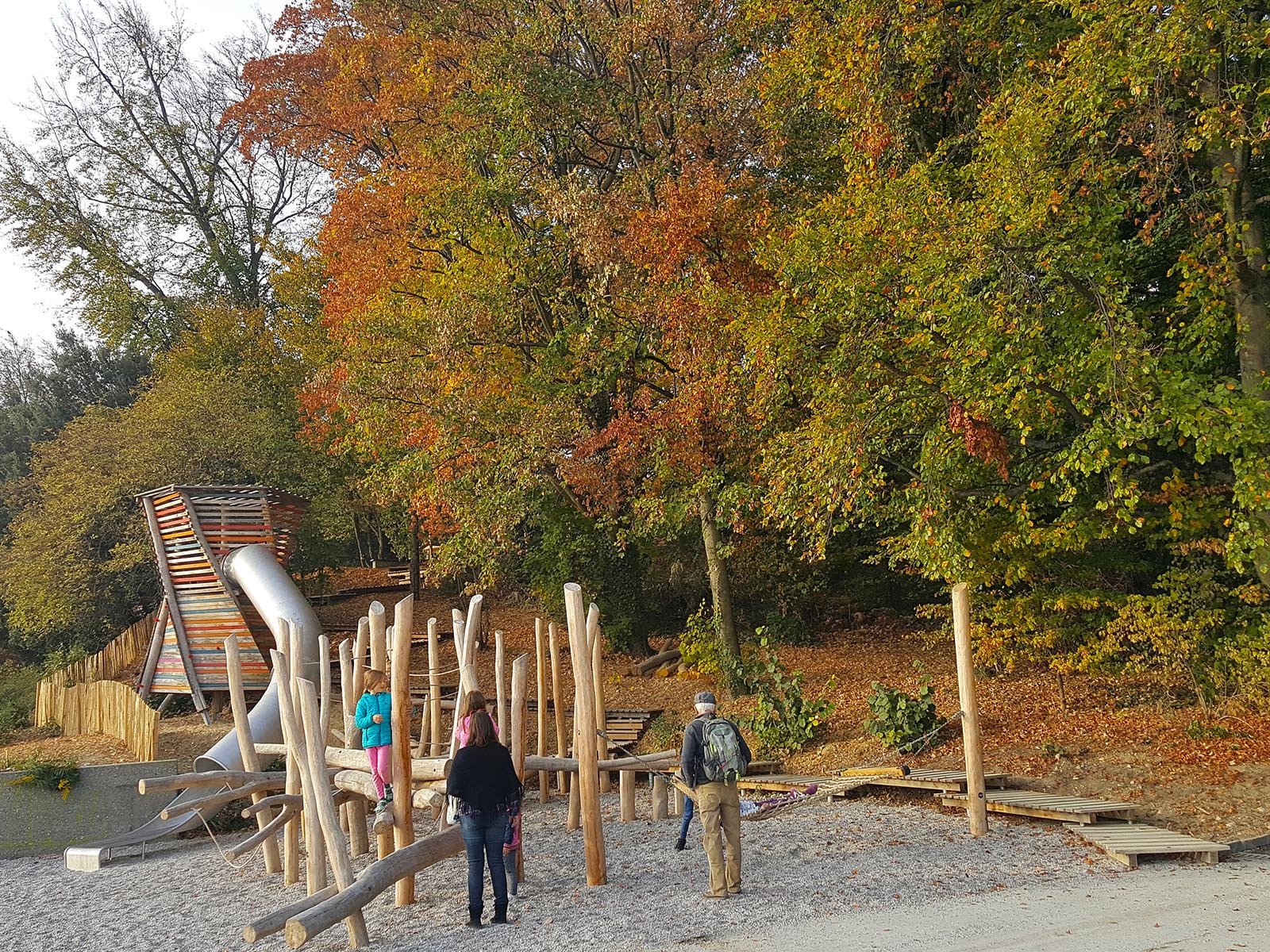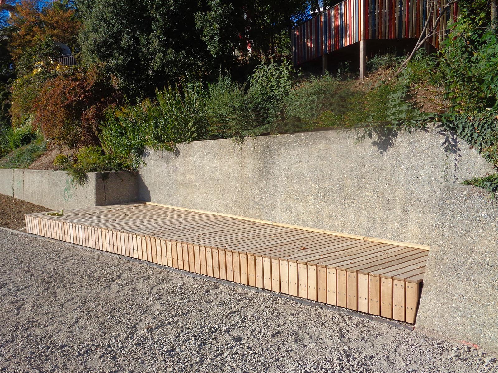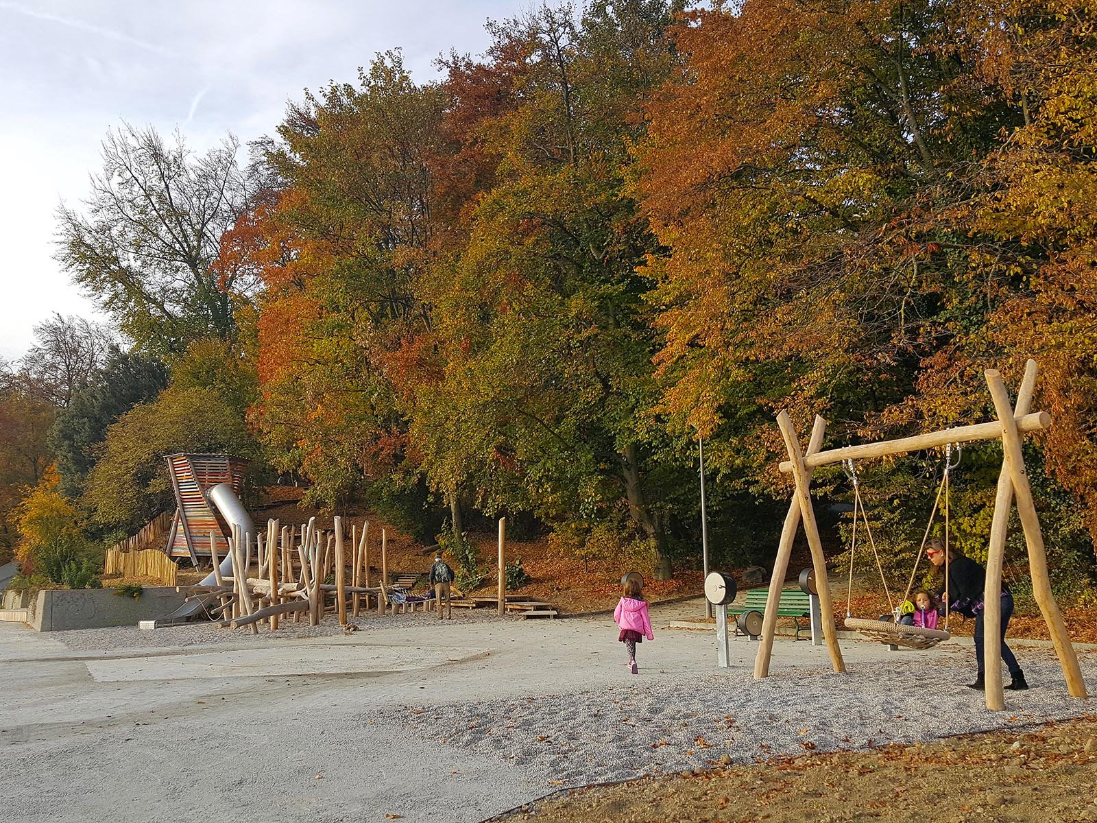 der spielplatz für die kleinen als auch der für die grösseren kinder hat einen waldähnlichen charakter und ist hauptsächlich aus rundholz gebaut. als verbindendes gestalungselement wählten wir eine feine, teilweise farbige lattung, die sowohl beim rutschahnturm wie auch bei den hütten der kleinkinder und in der belattung der podeste des waldweges einen akzent setzt.