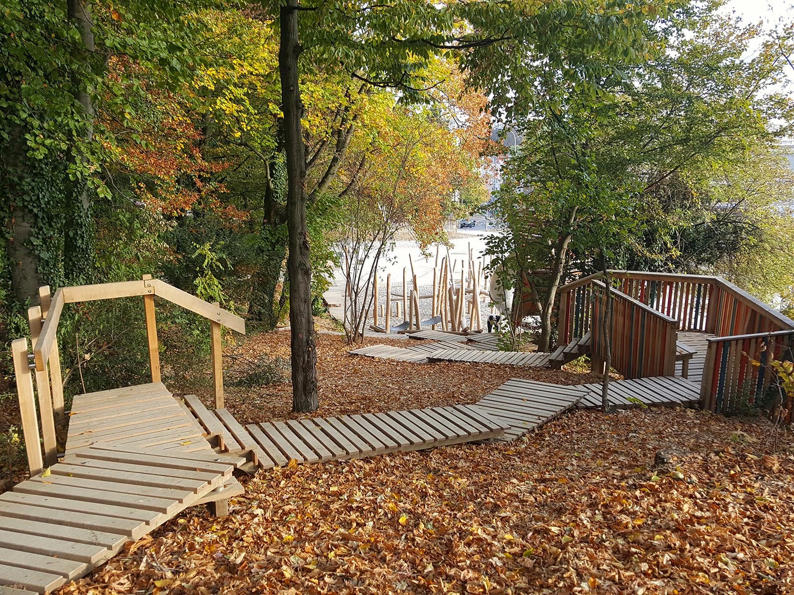 die wettbewerbsaufgabe lautete: im neu restaurierten park „beaulieu“, zwei spielangebote zu planen, die mit einem naturnahen steg durch den wald zu verbinden sind.
