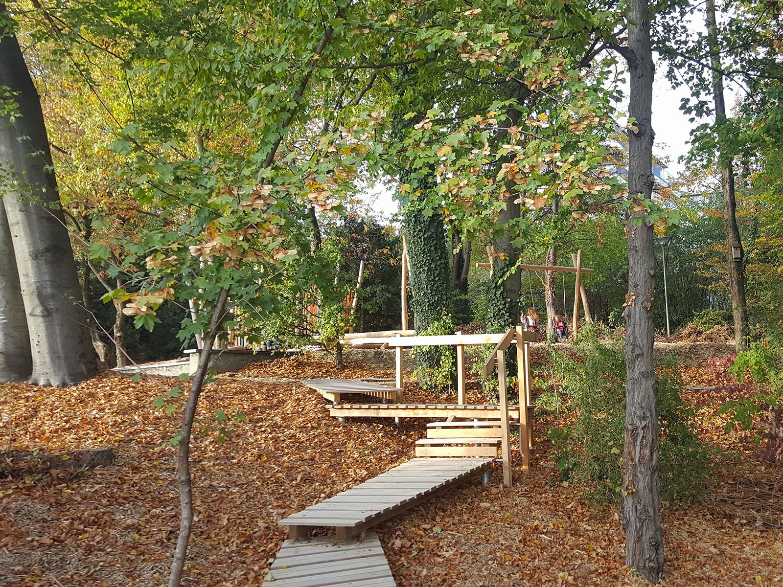 am turm vorbei führt ein verspielter podestweg durch den schönen baumbestand auf ein aussichtspodest. ausgerubt gehts weiter und man gelangt man zur oberen ebene des parks wo neben einer buvette (noch im bau) ein spielplatz für die kleinkinder steht. die eltern können in zukunft beim kaffee in die französischen alpen blickenden, währedem ihre kleinen daneben in der nähe spielen. für sie haben wir mit einem dreiteiligen baumhaus, einen spannenden ort für rollenspiele gebaut. zum klettern erbauten wir einem waldänlichen kletterparcours und eine doppelschaukel rundet das angebot ab.