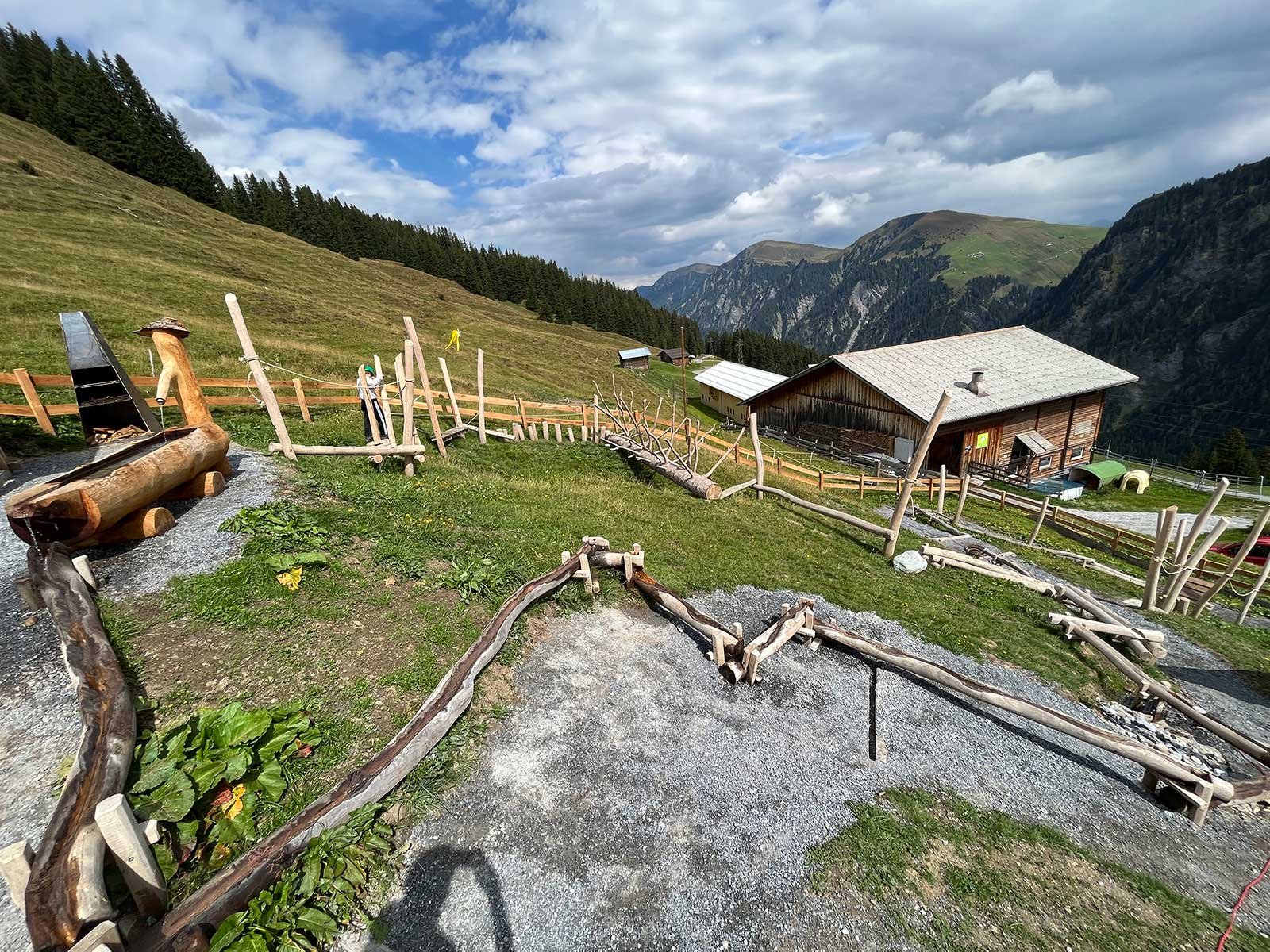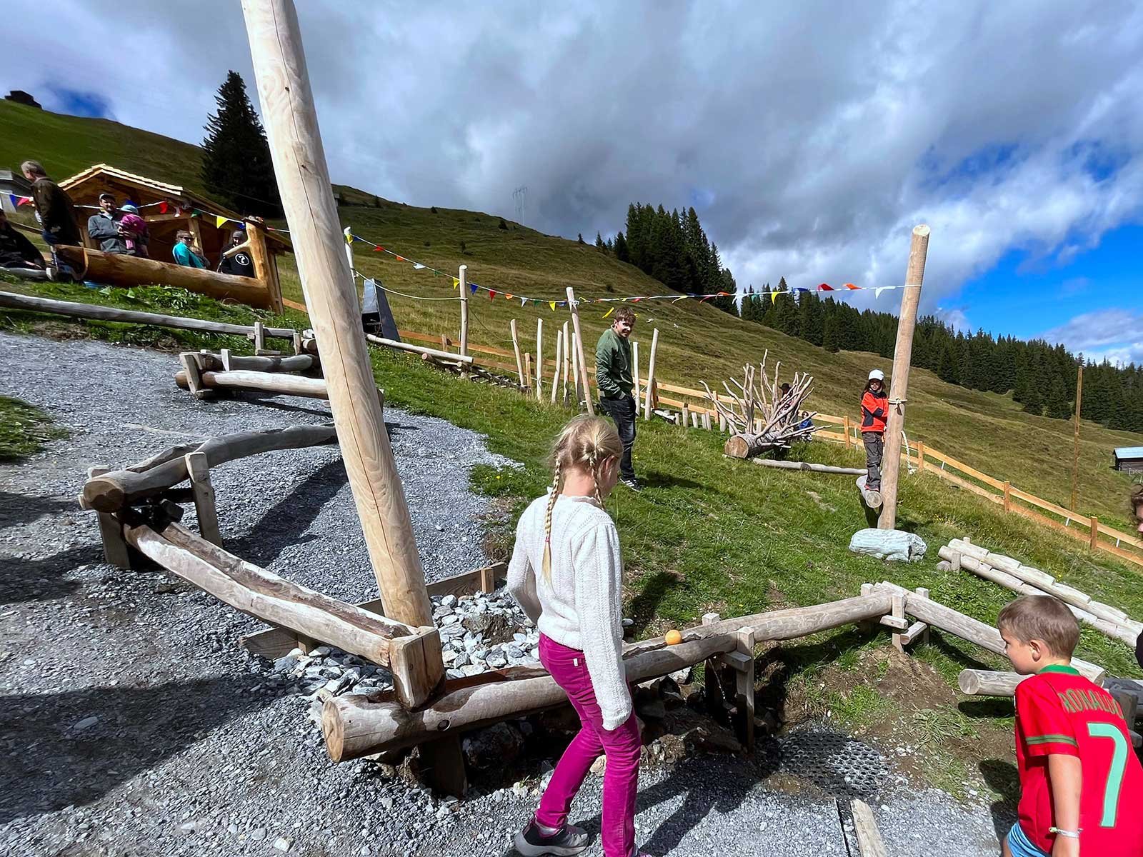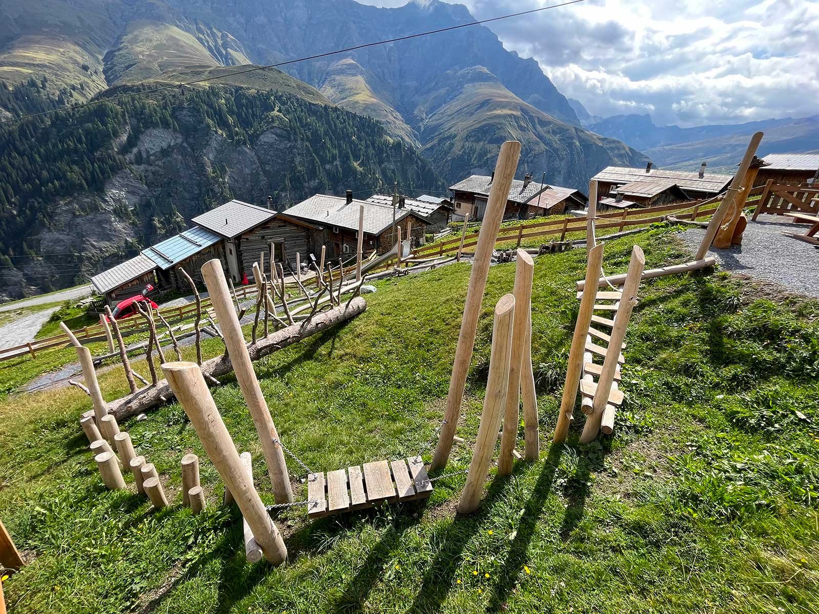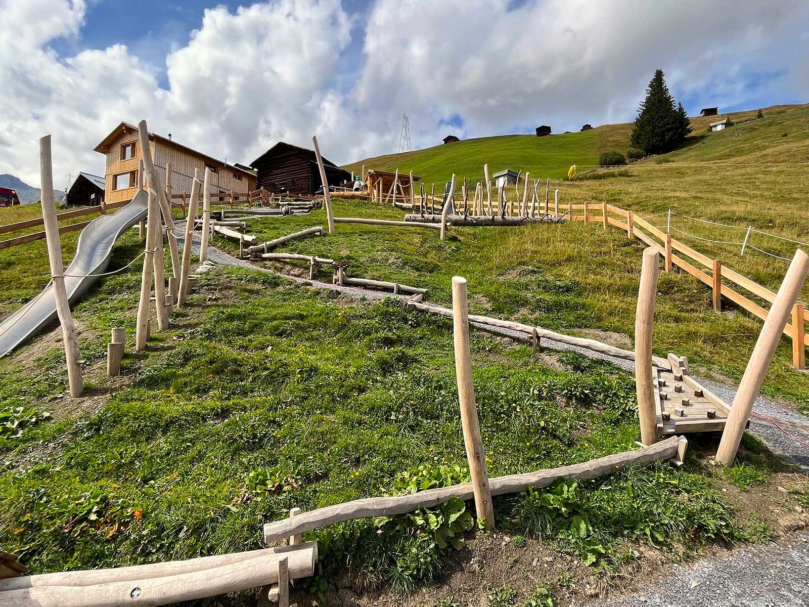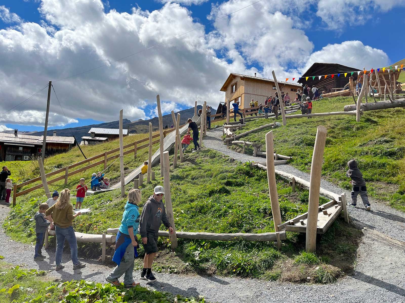so entstand der etwas andere alpin-spielplatz auf 1500m. er ermöglicht den kindern, kugeln beim herunterrollen zu begleiten, um dann via kletterparcours den hang hinauf zurück zum start der kugelbahn klettern. dort erwartet sie ein sitzplatz mit schöner aussicht, grill und kleinem häuschen als wetterschutz. gleich daneben bauten wir für die kleineren kinder einen sandhaufen und ein spielhüsli. so können diese im blickfeld ihrer eltern spielen.