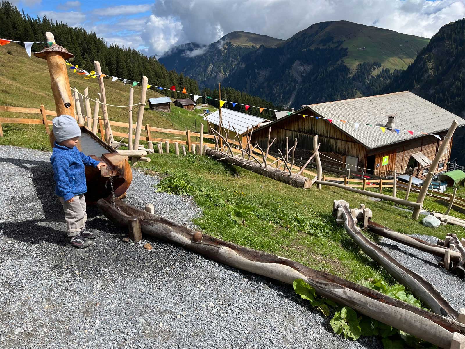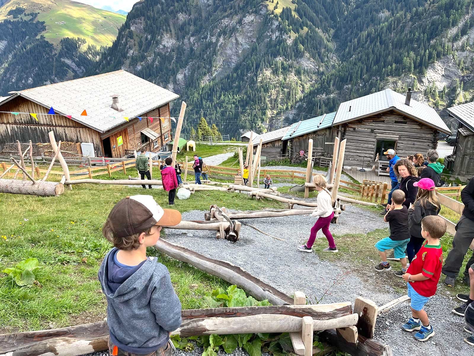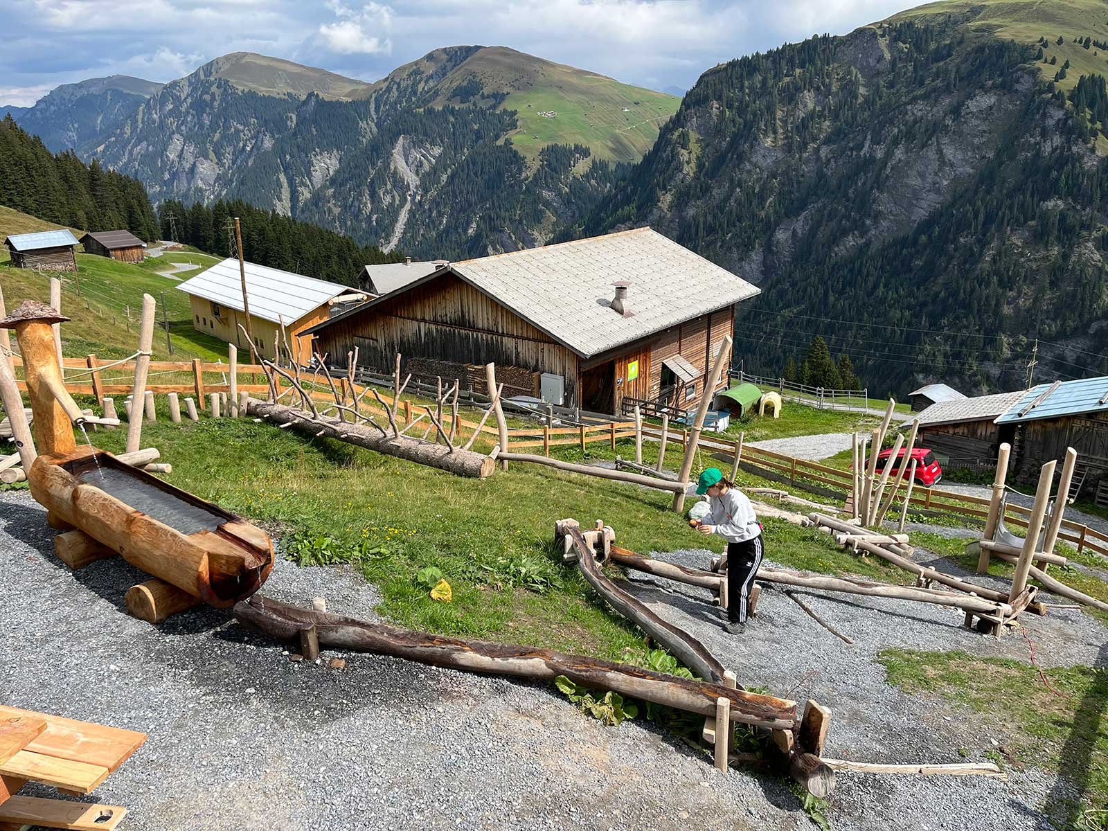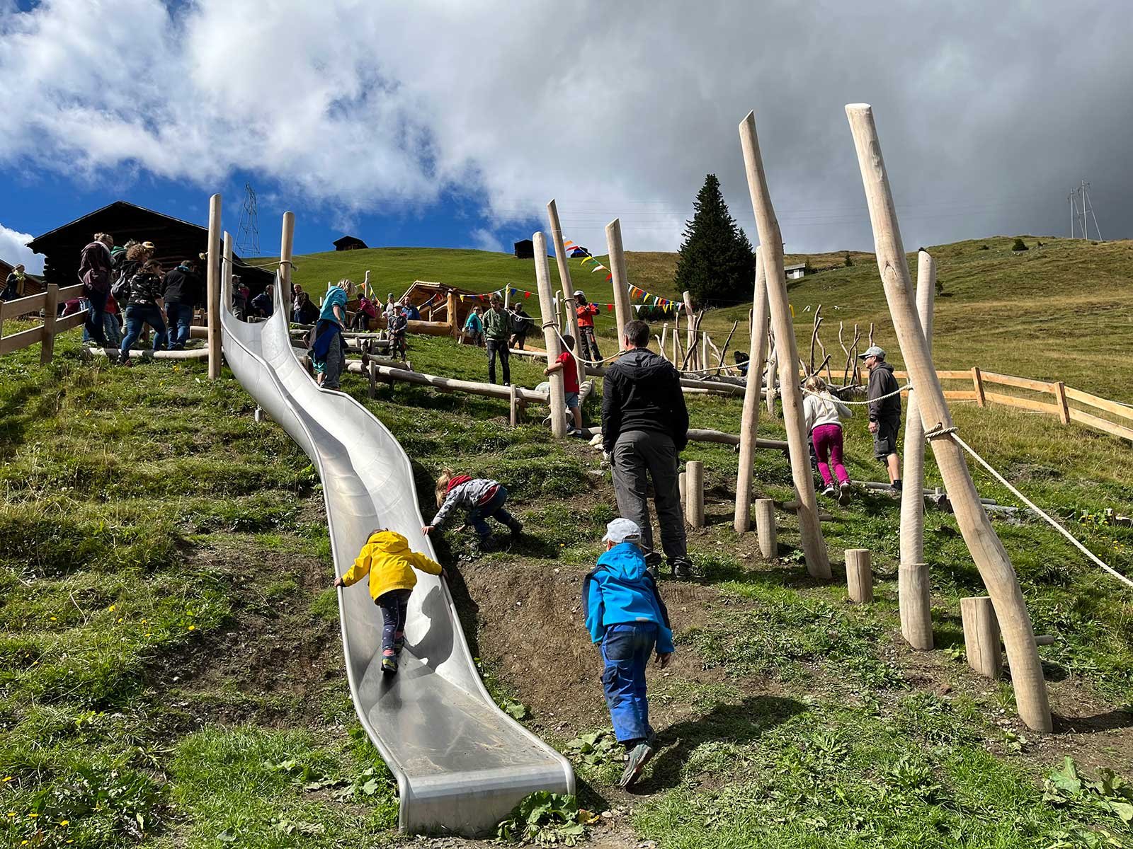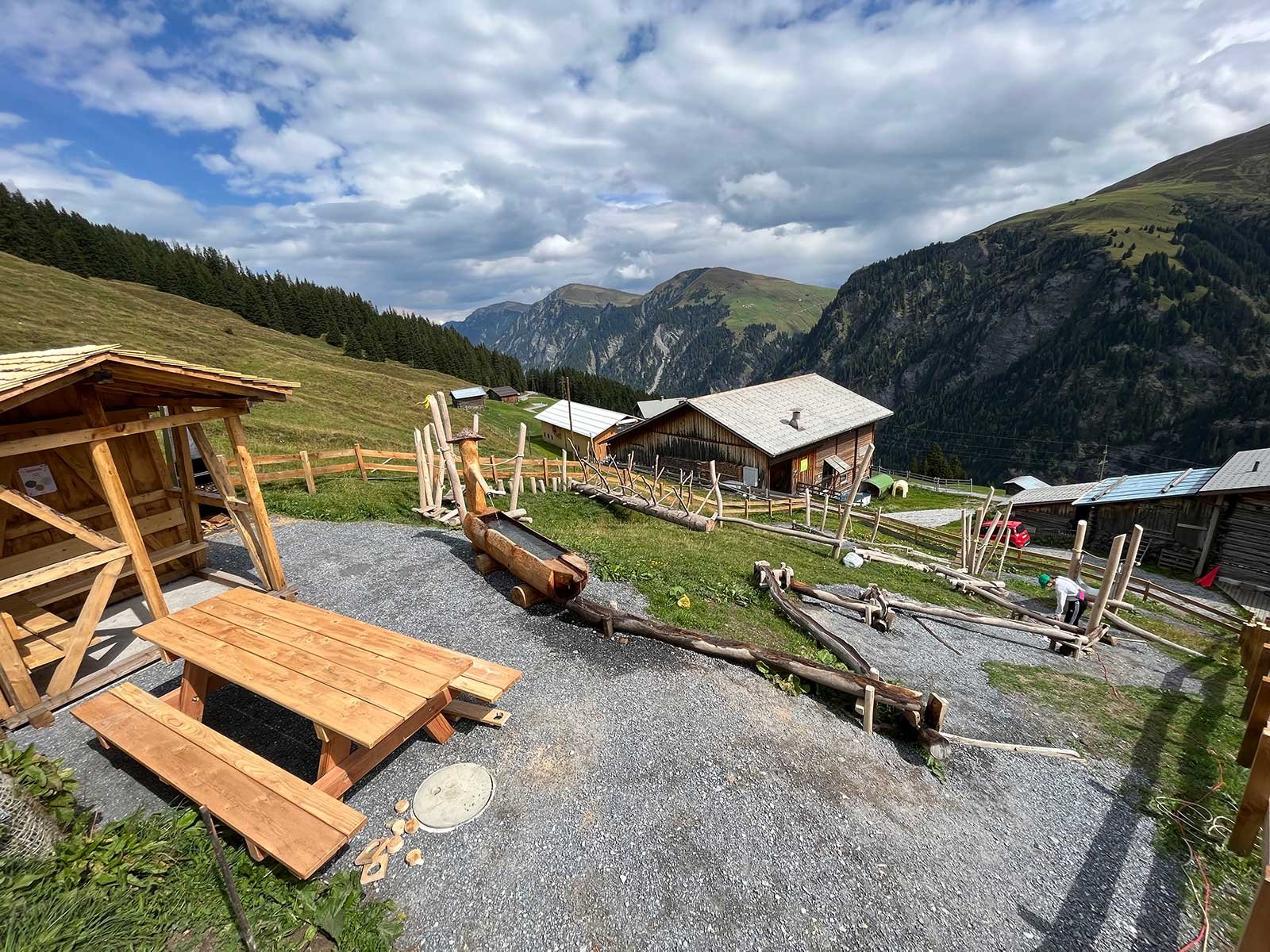 so entstand der etwas andere alpin-spielplatz auf 1500m. er ermöglicht den kindern, kugeln beim herunterrollen zu begleiten, um dann via kletterparcours den hang hinauf zurück zum start der kugelbahn klettern. dort erwartet sie ein sitzplatz mit schöner aussicht, grill und kleinem häuschen als wetterschutz. gleich daneben bauten wir für die kleineren kinder einen sandhaufen und ein spielhüsli. so können diese im blickfeld ihrer eltern spielen.