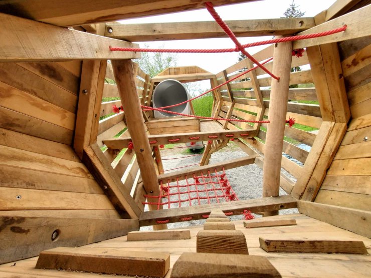 der drei meter grosse fuchs kann am ganzen körper beklettert werden und belohnt die kinder mit einer abfahrt aus der röhrenrutsche oder der feuerwehrstange beim kopf. ein kletter- und balancierparcour verbindet den fuchs mit dem hasen auf dem hügel und lässt die kinder eine tolle lange strecke beklettern.
