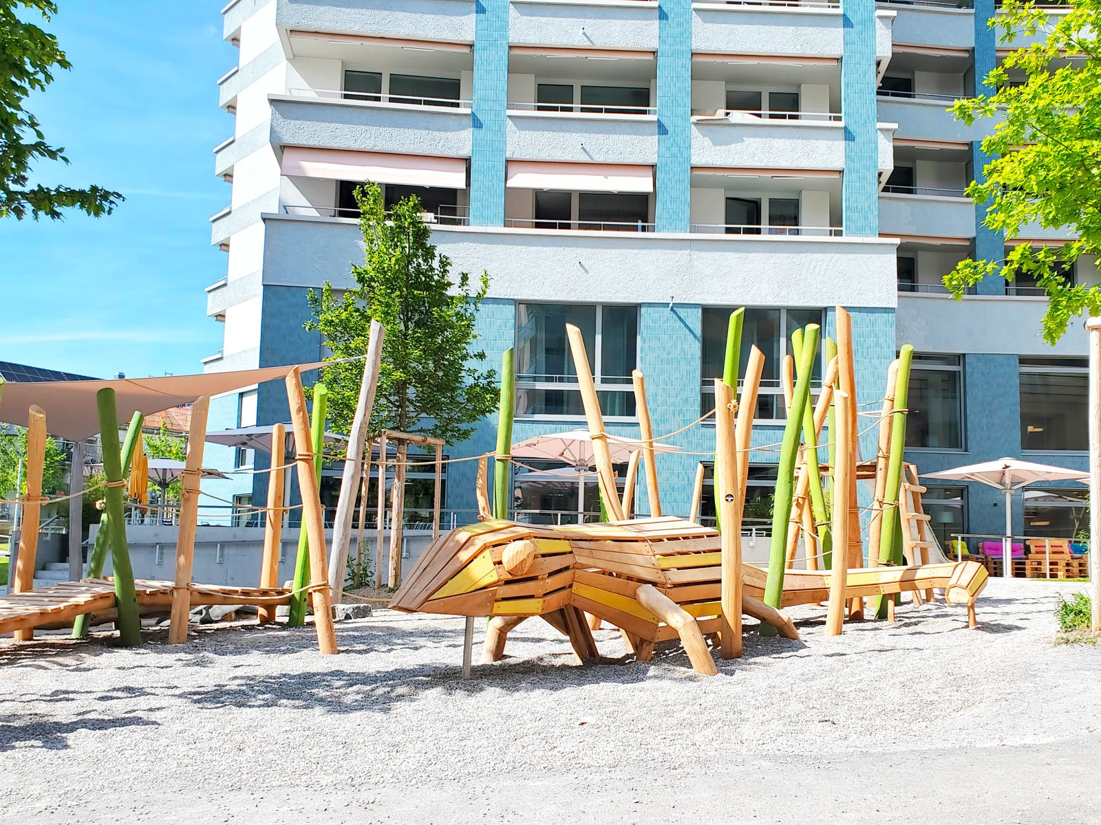 als identifikationspunkt befindet sich in der mitte des platzes ein salamander. dieser ist an einen kletterbereich angebunden, der zu einer rutsche führt. zudem schliesst er an einen balancierweg für kleinkinder an.