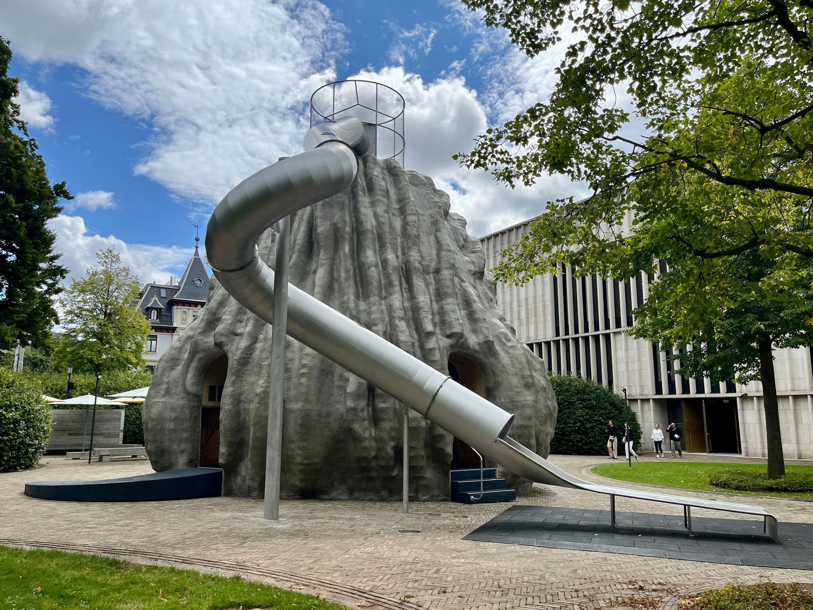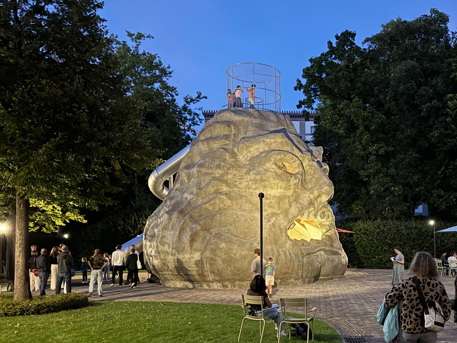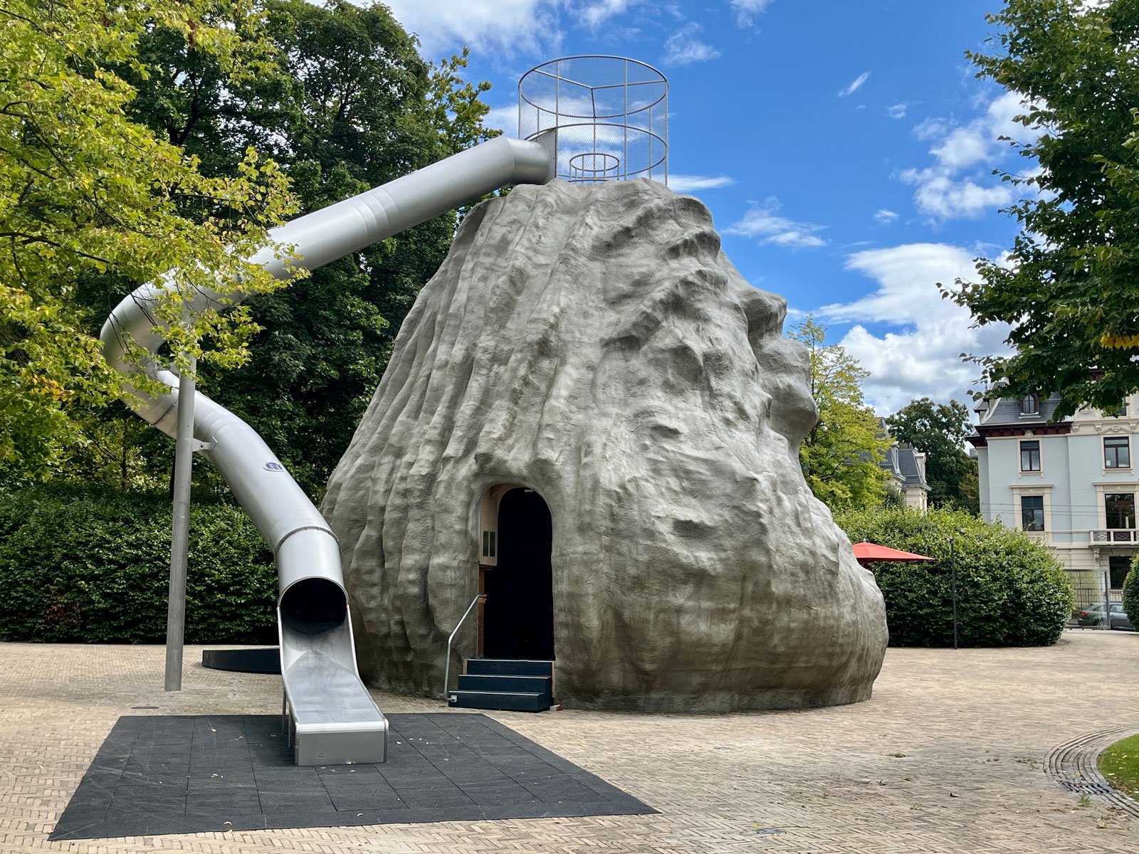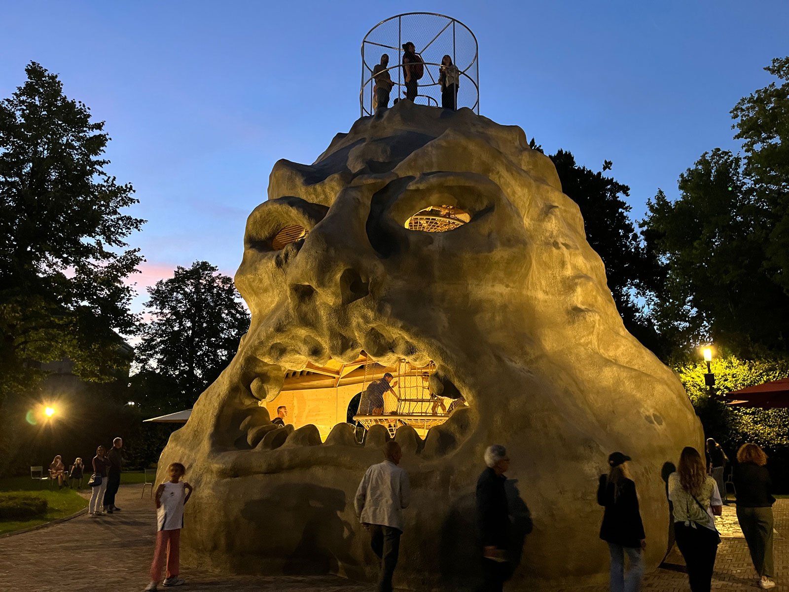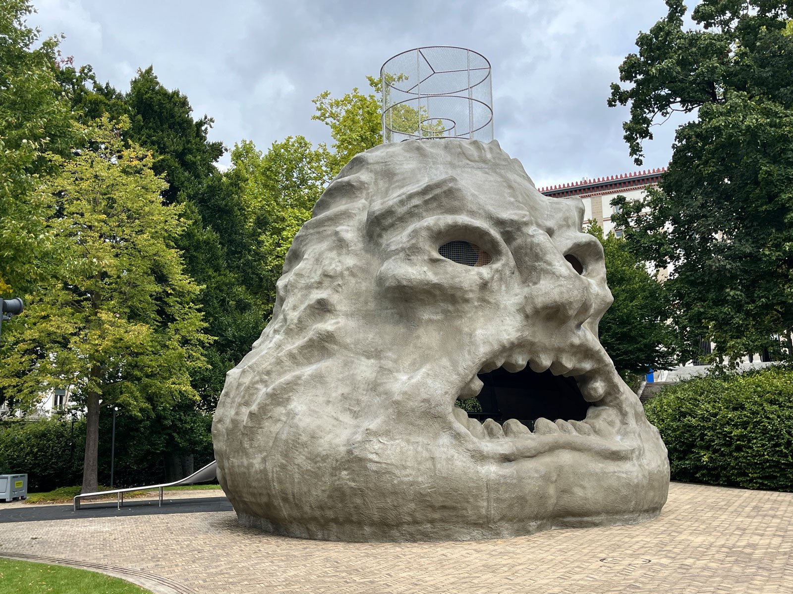 im inneren des monsterkopfs befindet sich ein hängender kletteraufstieg, oben eine aussichtsplattform – und aussen führt eine röhrenrutsche wieder hinunter.