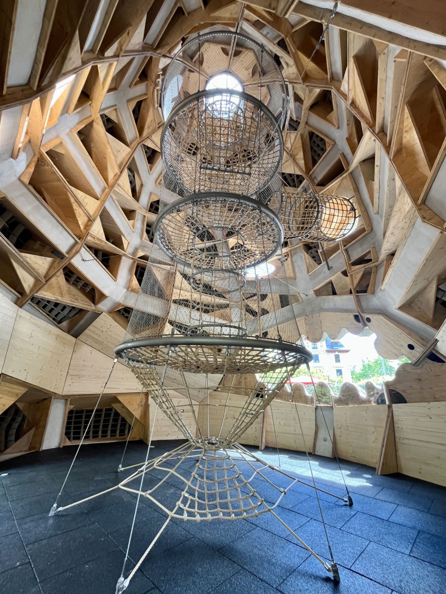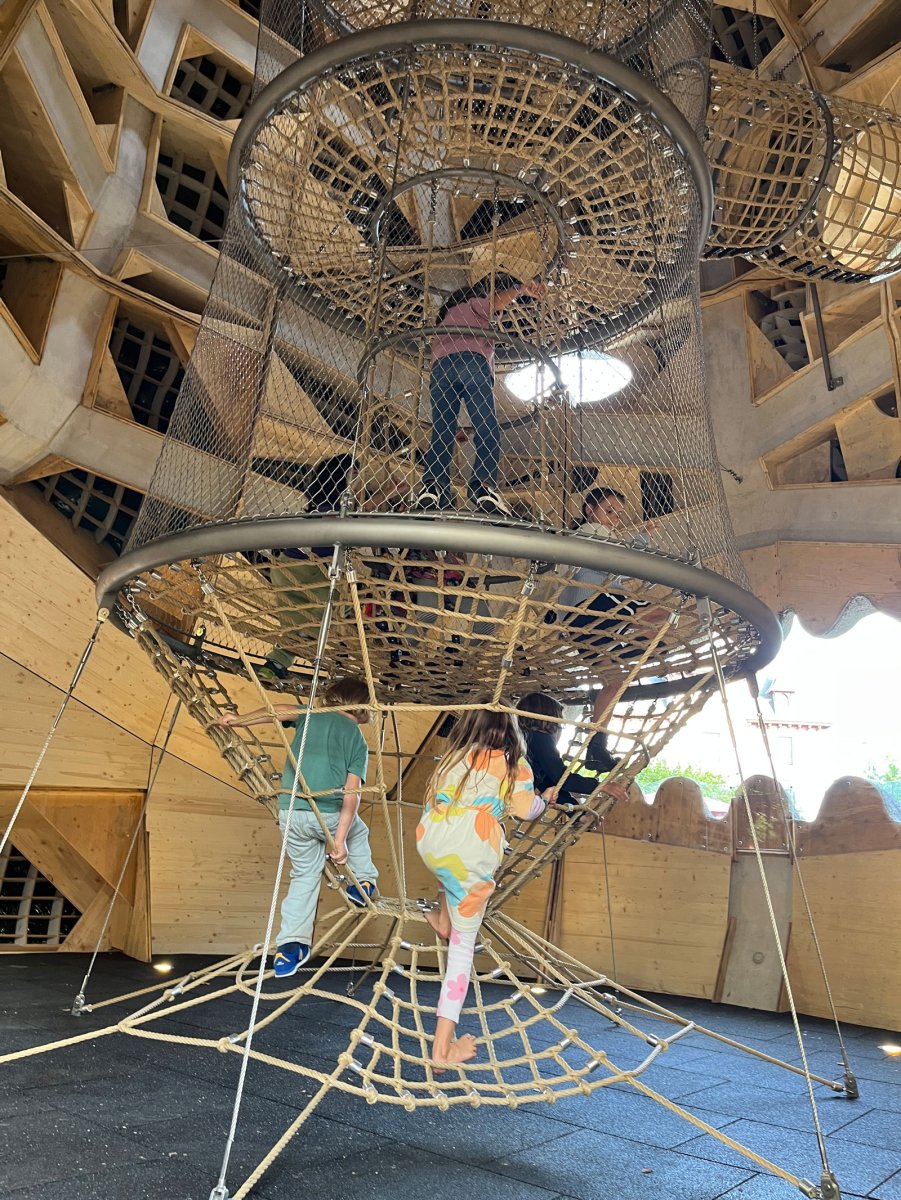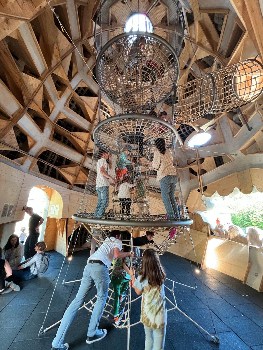 über den sanduhrförmigen kletteraufstieg können kinder in etappen bis auf acht meter höhe klettern – mit zwischenstopps auf vier podesten zum verschnaufen. oben angekommen, geniessen sie die rundumsicht in 360° – bevor sie sich mit schwung die röhre hinunter sausen.
