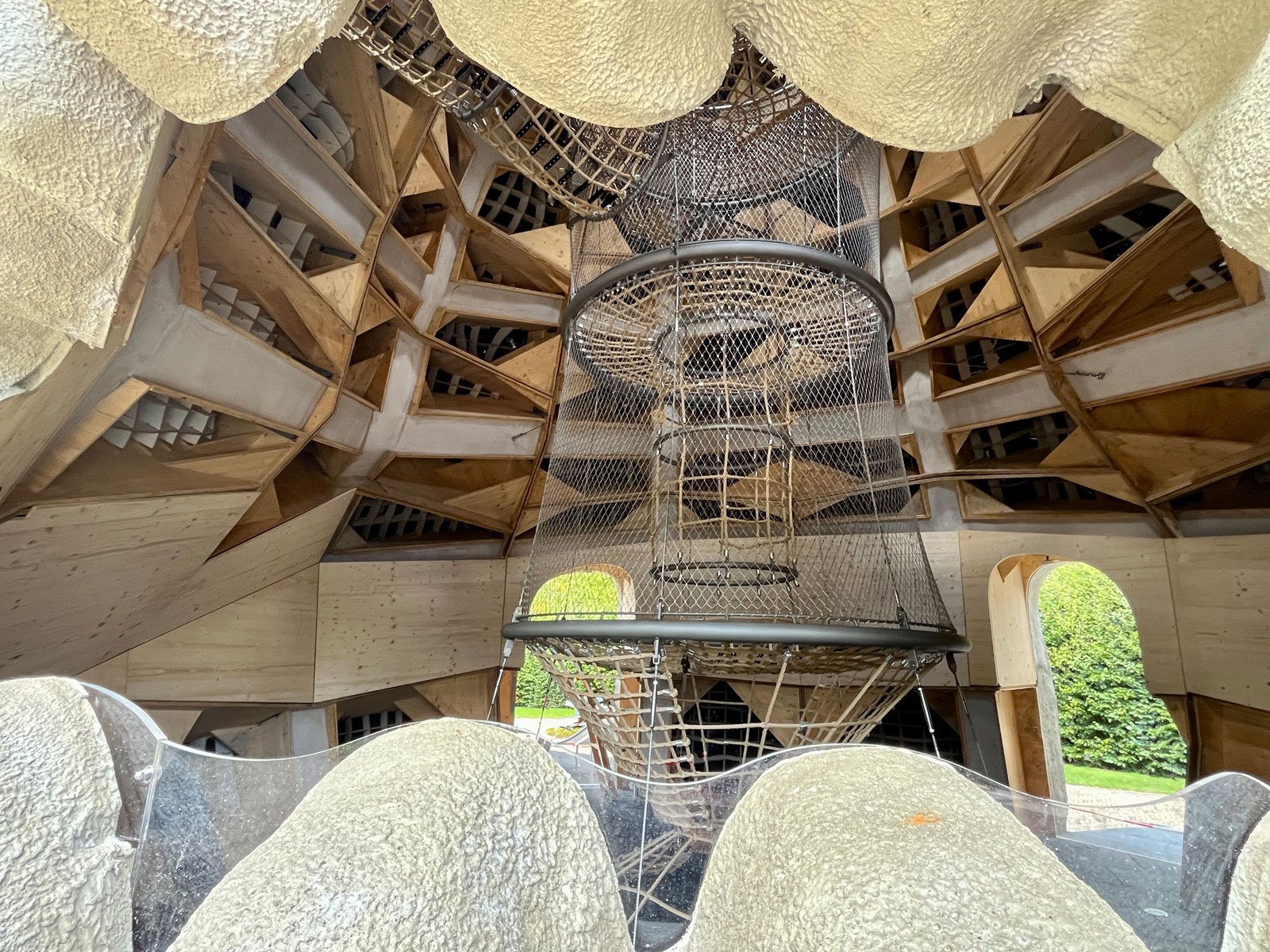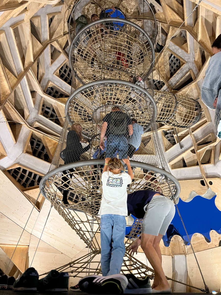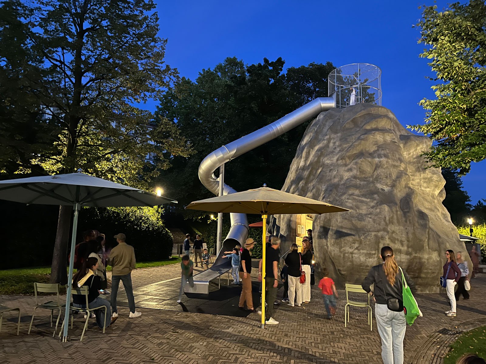 über den sanduhrförmigen kletteraufstieg können kinder in etappen bis auf acht meter höhe klettern – mit zwischenstopps auf vier podesten zum verschnaufen. oben angekommen, geniessen sie die rundumsicht in 360° – bevor sie sich mit schwung die röhre hinunter sausen.