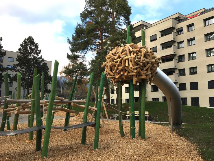 die in den siebzigerjahren gebaute siedlung paradies wurde in den letzten jahren gesammtsaniert. der spielplatz im landschaftlich spannenden innenhof ,mit hügeln und waldmässiger baumstruktur, war während der bauzeit installationsplatz. um dafür einen neuen naturnahen spielplatz zu planen, konnten wir mit den kindern der siedlung in einem partizipationsverfahren eine spielplatzidee zum thema mit dem thema dschungel planen. mit den ideen der kinder entwickelten wir zwei spanndende spielbereiche in grünen dschungel-stämmen. für die grossen kinder ein hohes nest mit röhrenrutsche und einem kletterparcours mit dschungelfelsen. für die kleinen kinder bildet eine dschungelhütte das zentrum eines balancierparcours mit verschiedenen spannenden geräten. eine wasserpumpe mit kleinem bächlein ergänzen die anlage zum kinder-paradies.