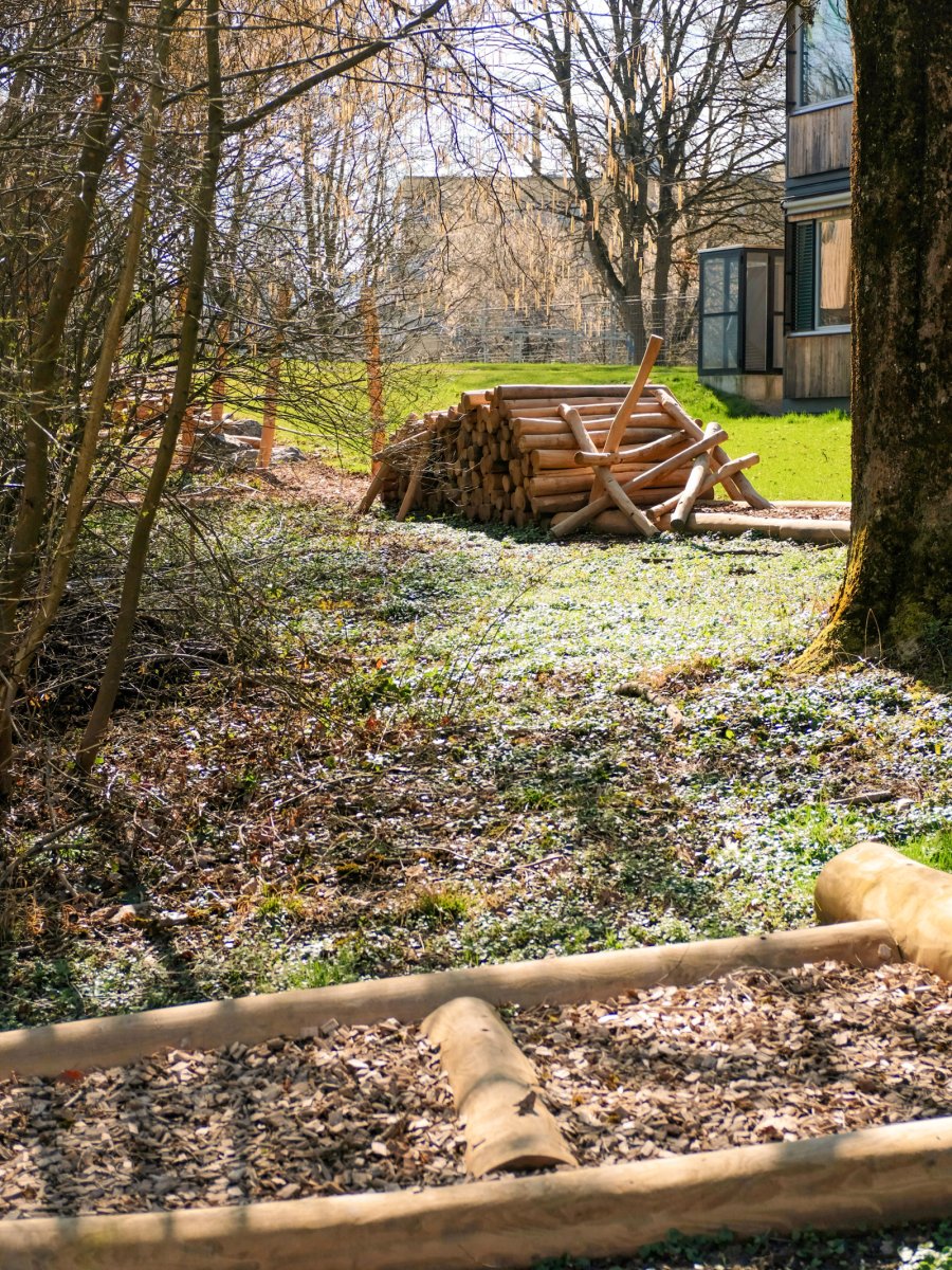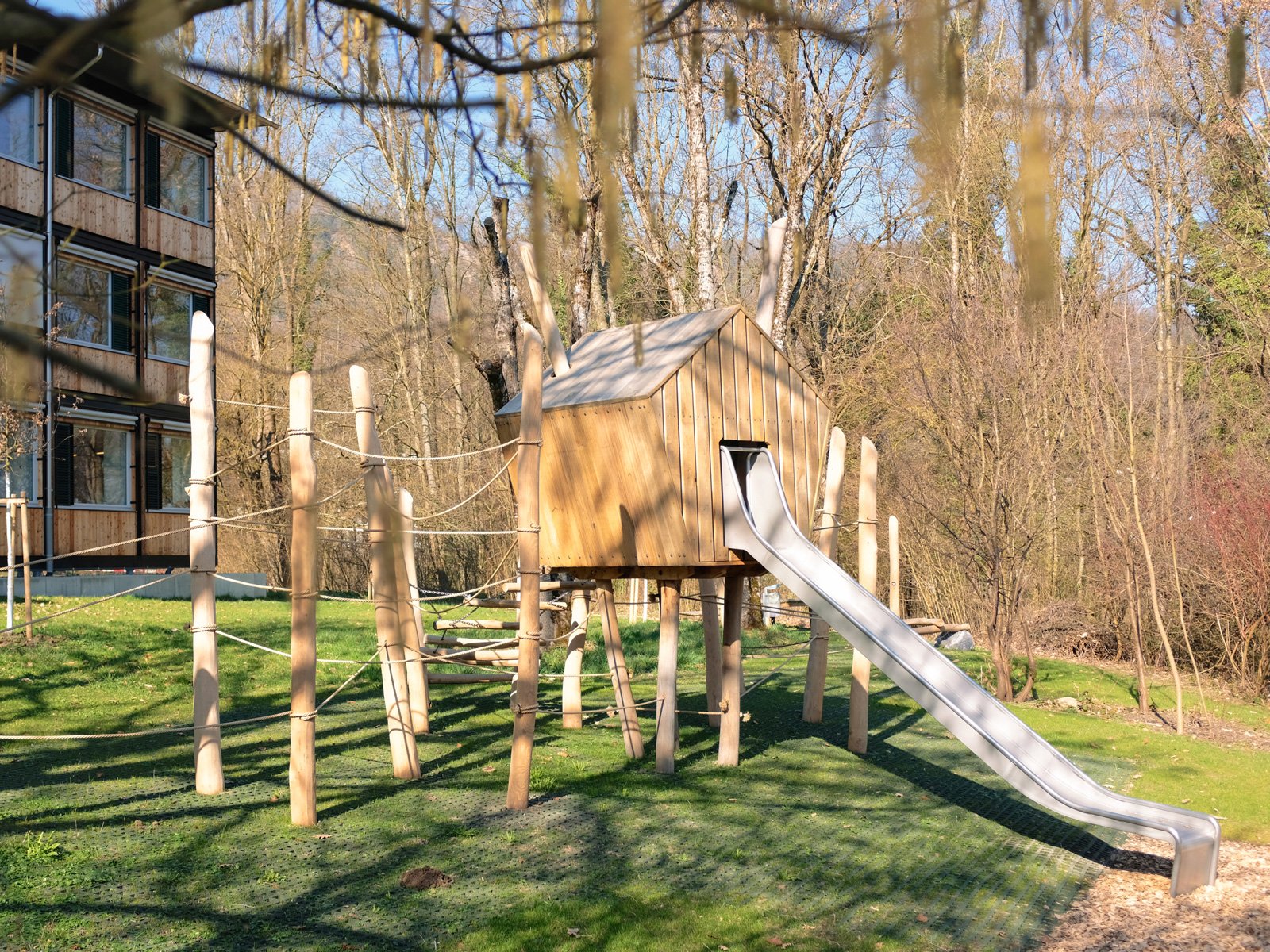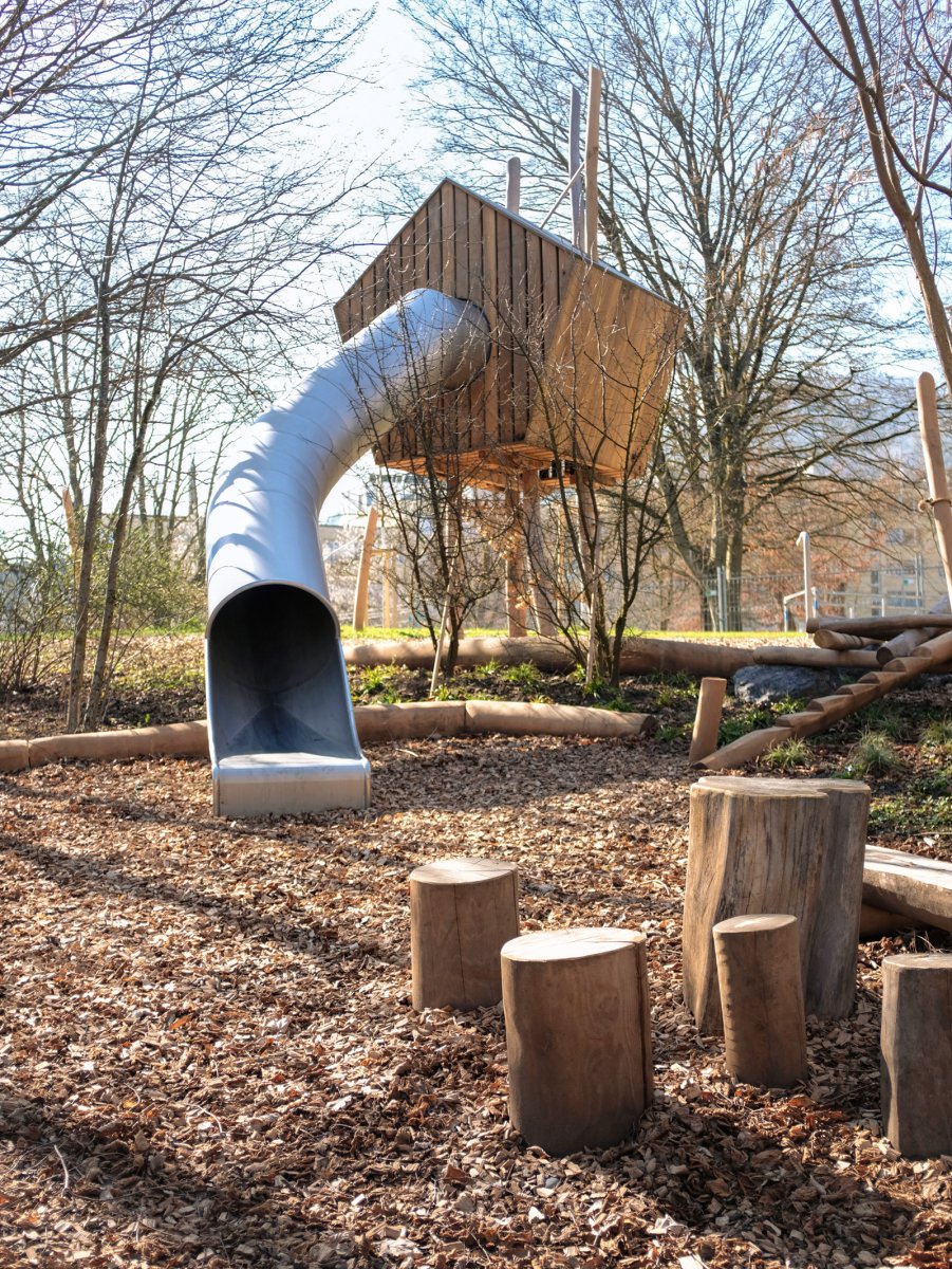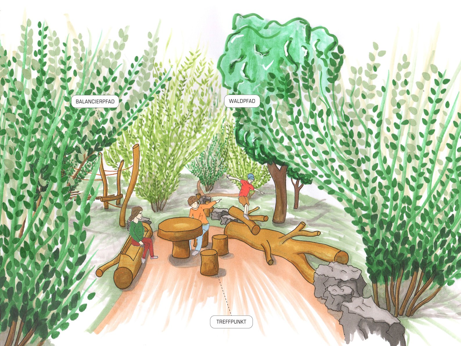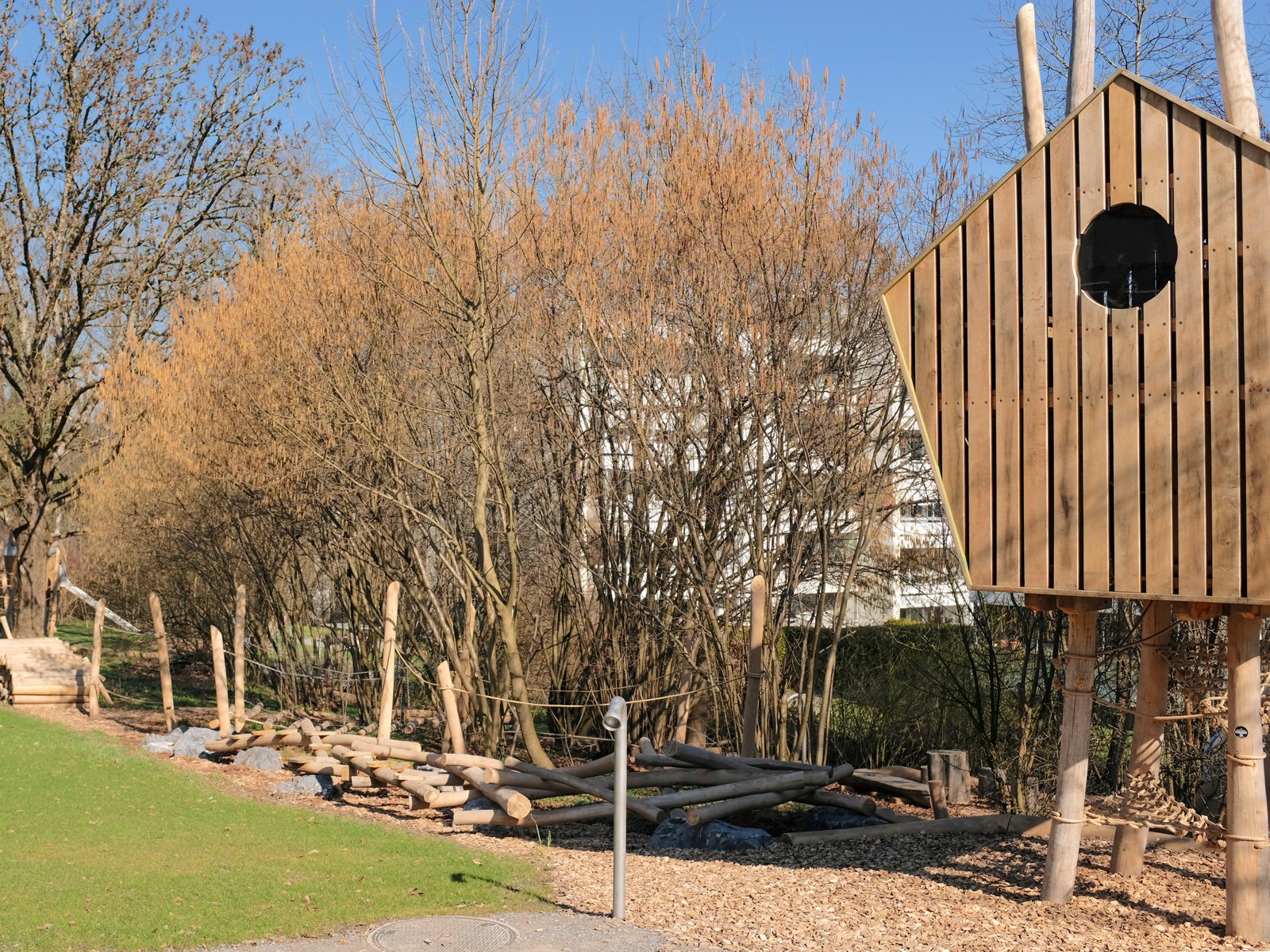 In Zusammenarbeit mit Team-Landschaftarchitekten entstand eine Spielanlage, die sich über den gesamten Bereich erstreckt und verschiedene Nischen, Verstecke und Aufenthaltsorte schafft. Diese Orte sind durch ein vielfältiges Wegenetz aus Trampelpfaden, Balancierelementen, Treppen und chaussierten Wegen miteinander verbunden.