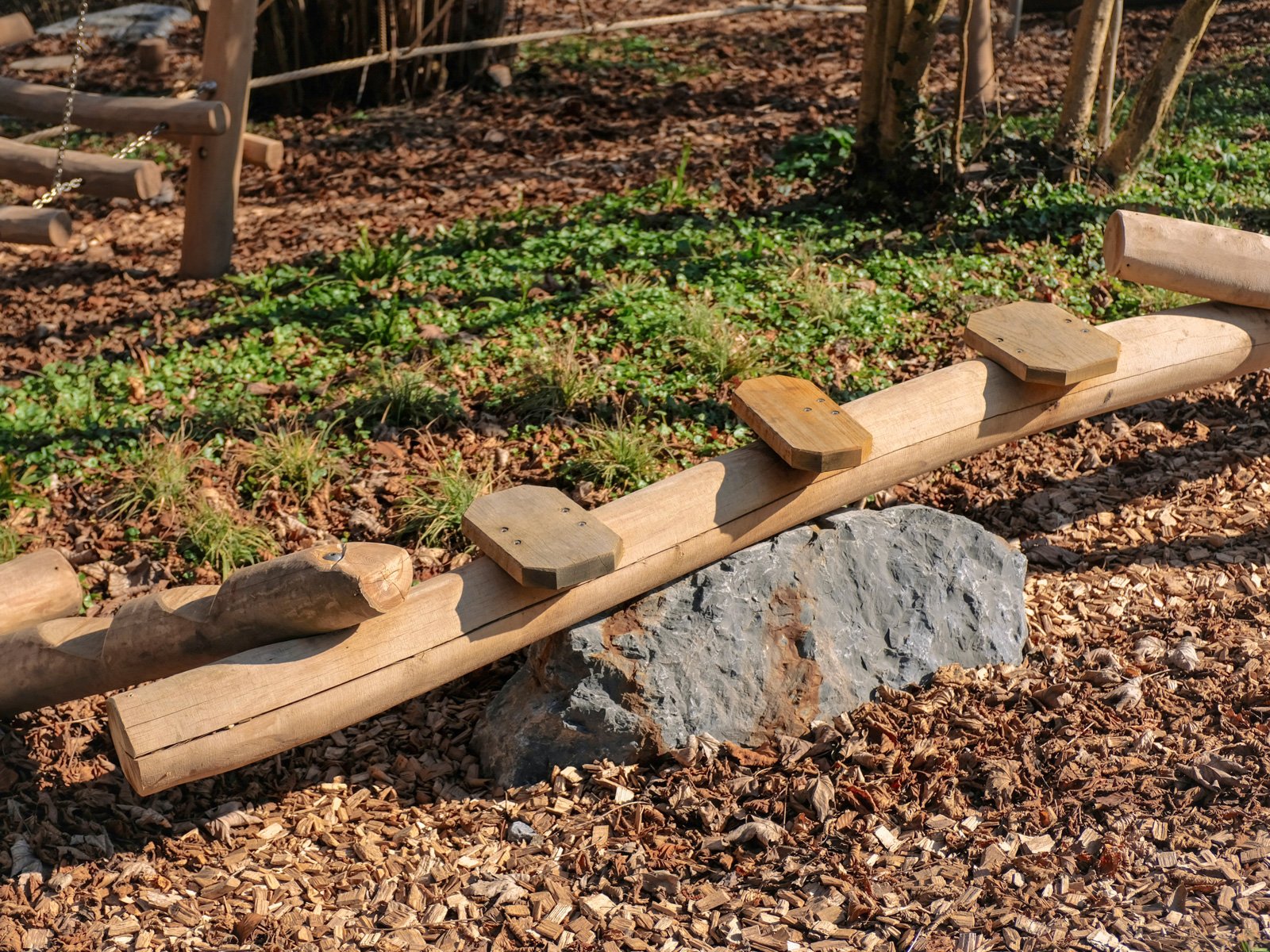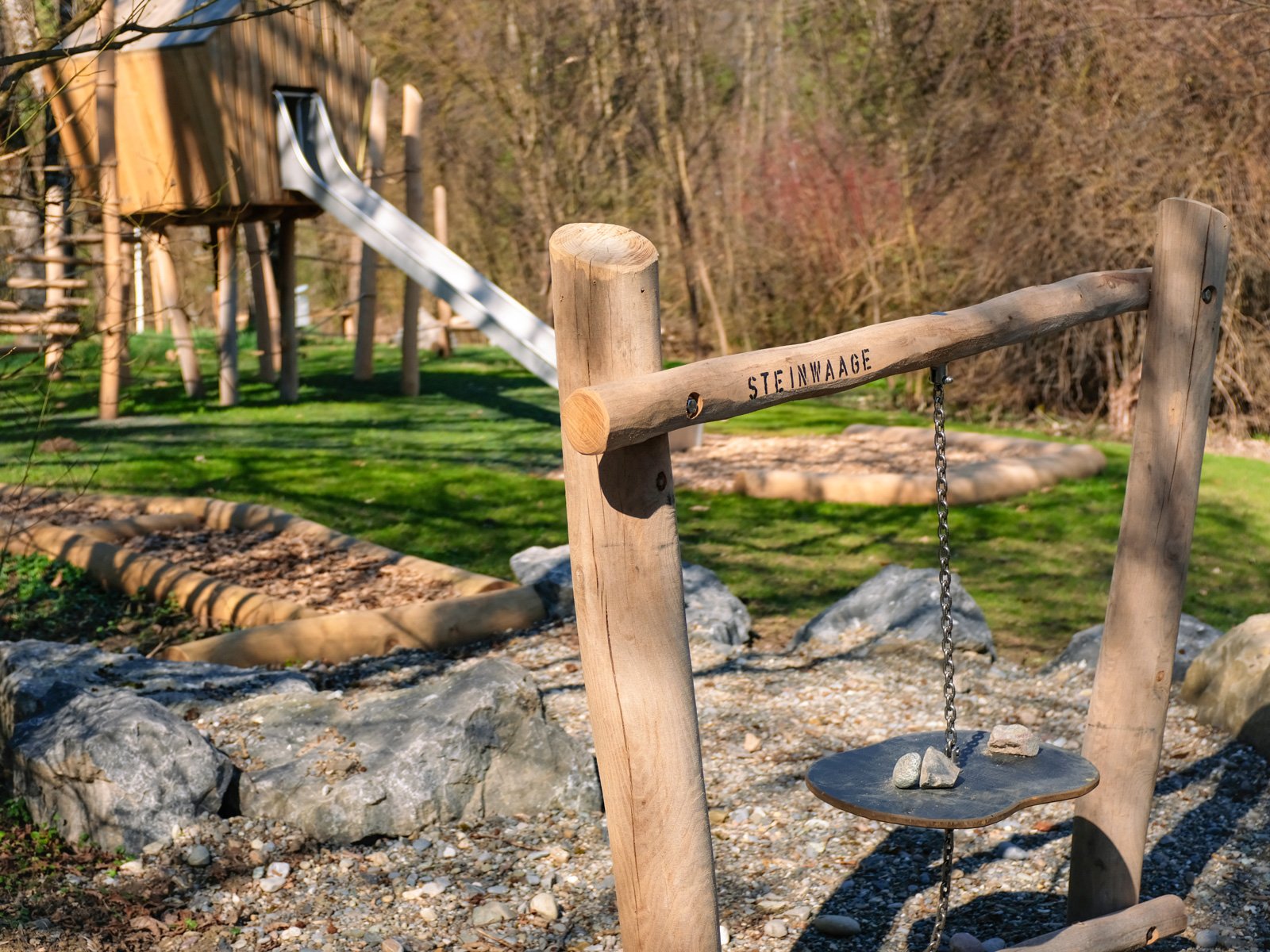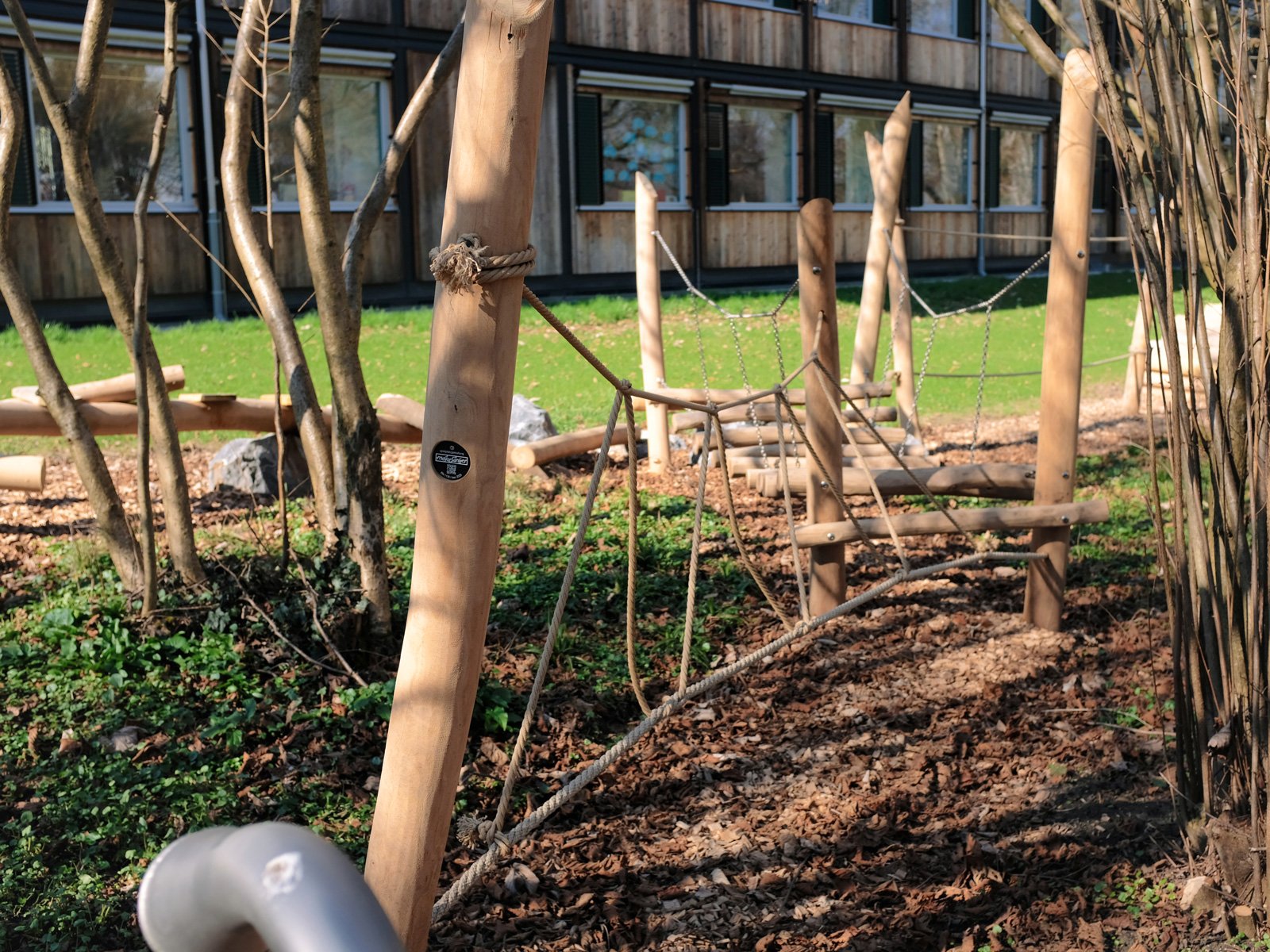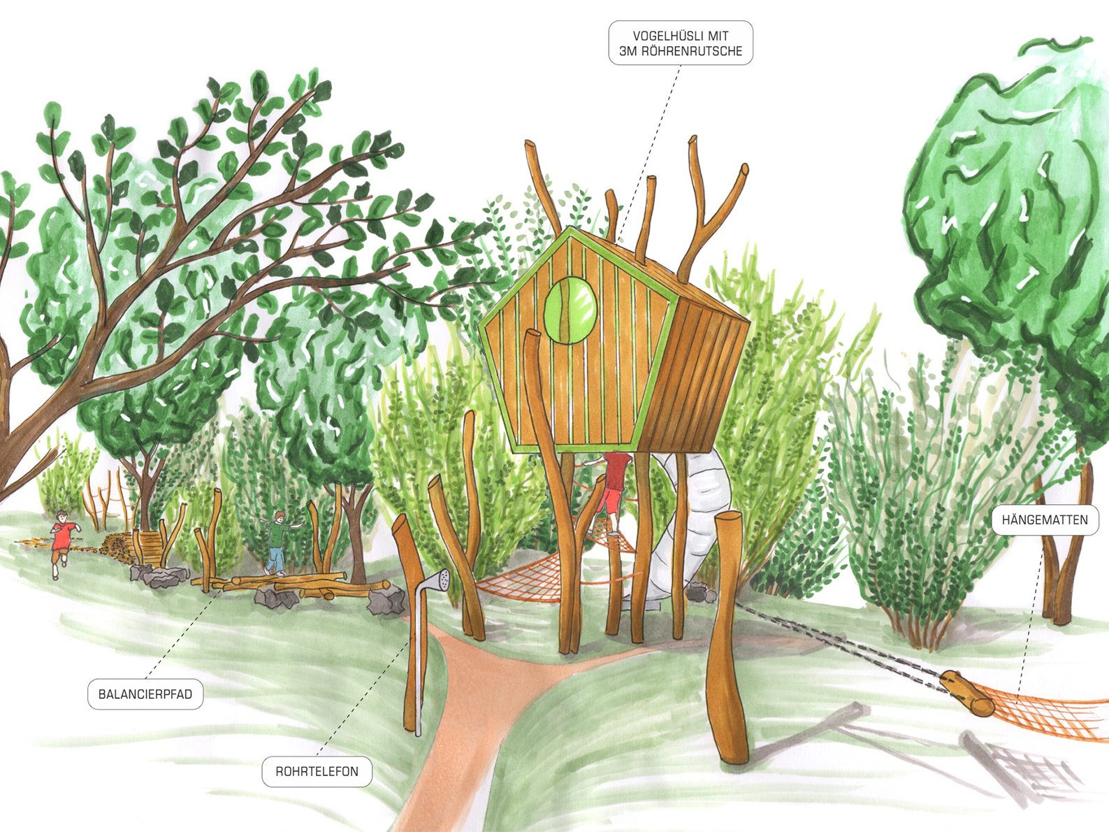 Die Spielgeräte wurden naturnah aus rohen Robinienstämmen, Steinen und beigen Seilen gefertigt und vor Ort an die Gegebenheiten der Hecke angepasst. Zwei Spielhäuser, die an Vogelhäuschen erinnern, bilden den Ausgangspunkt von zwei Rutschen. Neben den vielfältigen Kletter- und Balancierangeboten bietet der Spielplatz zahlreiche Sinneserfahrungen sowie unterschiedliche Treffpunkte mit grosszügigen Sitzflächen.