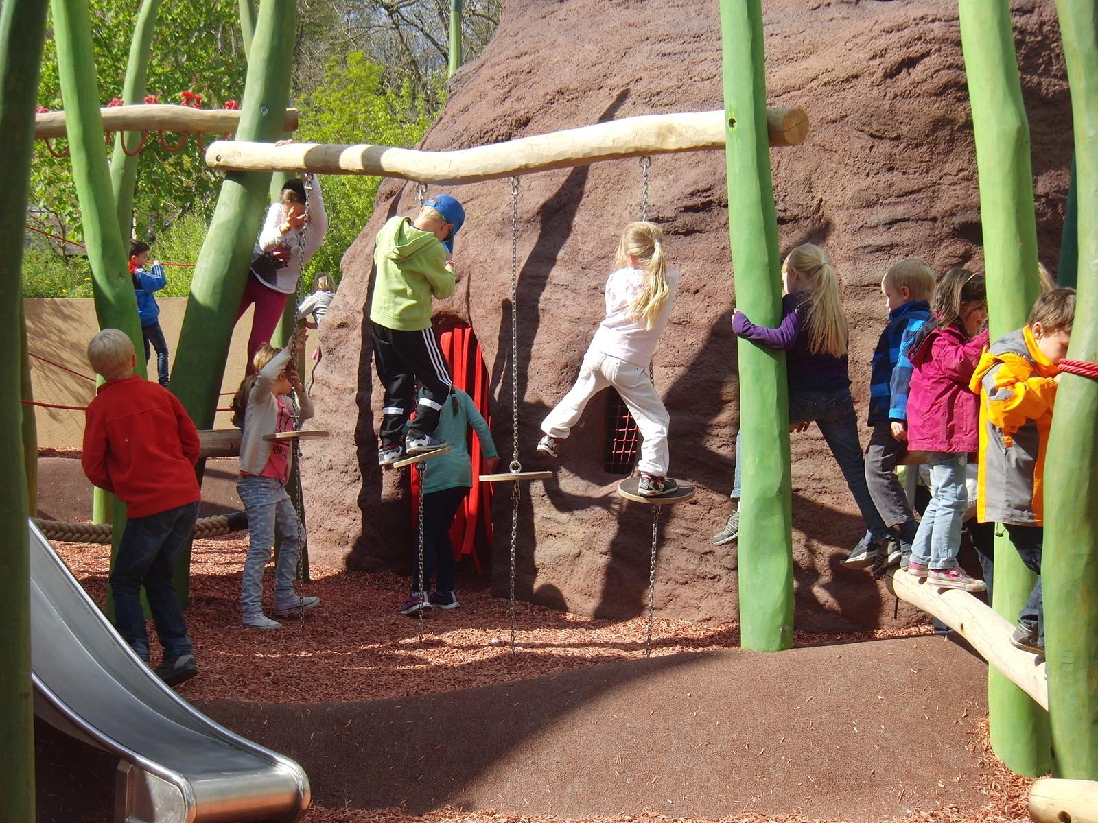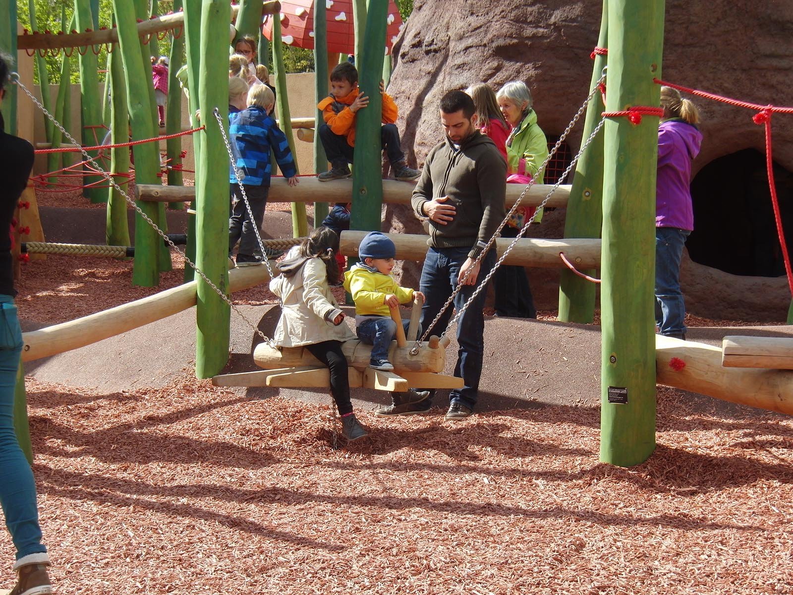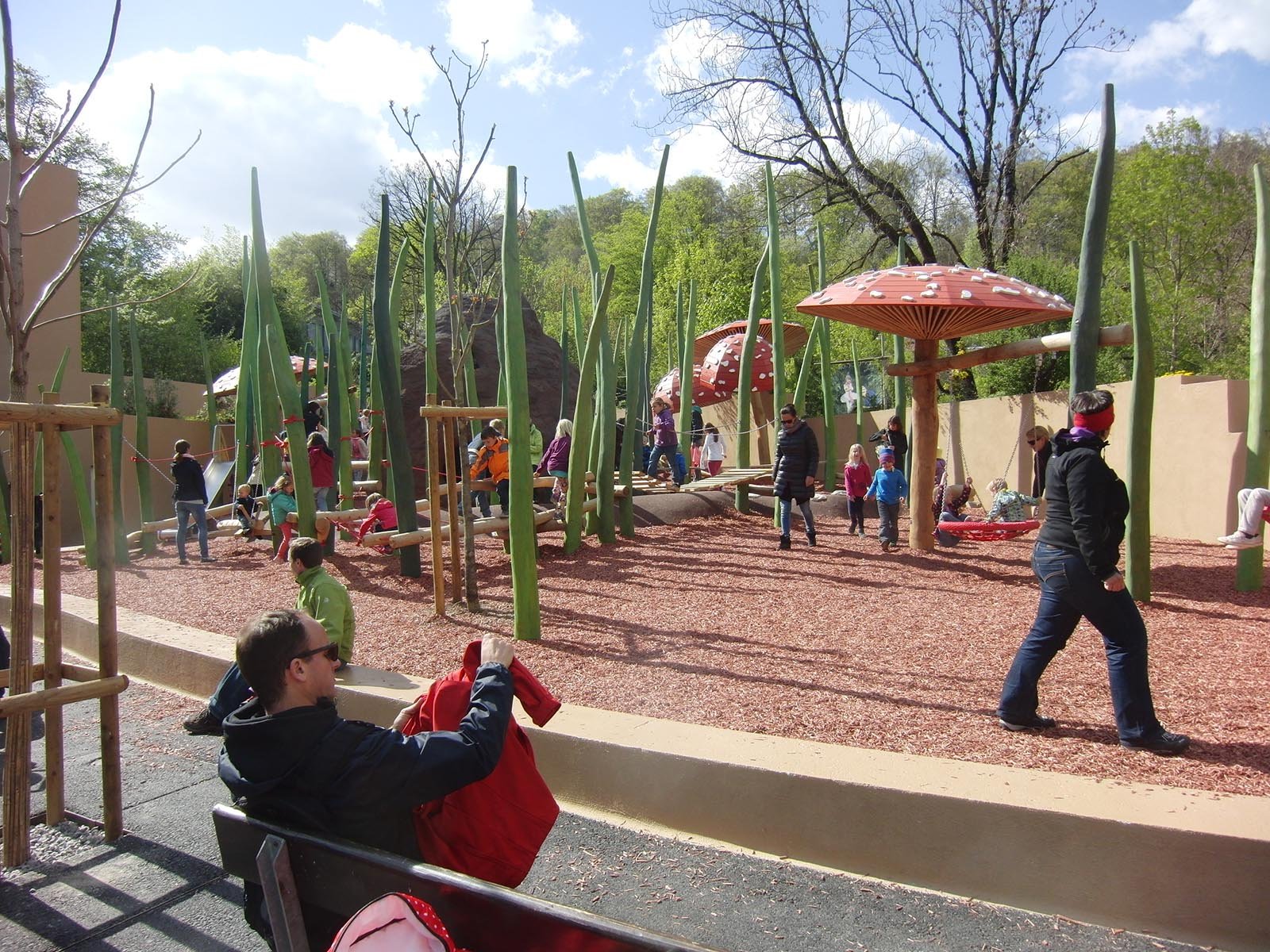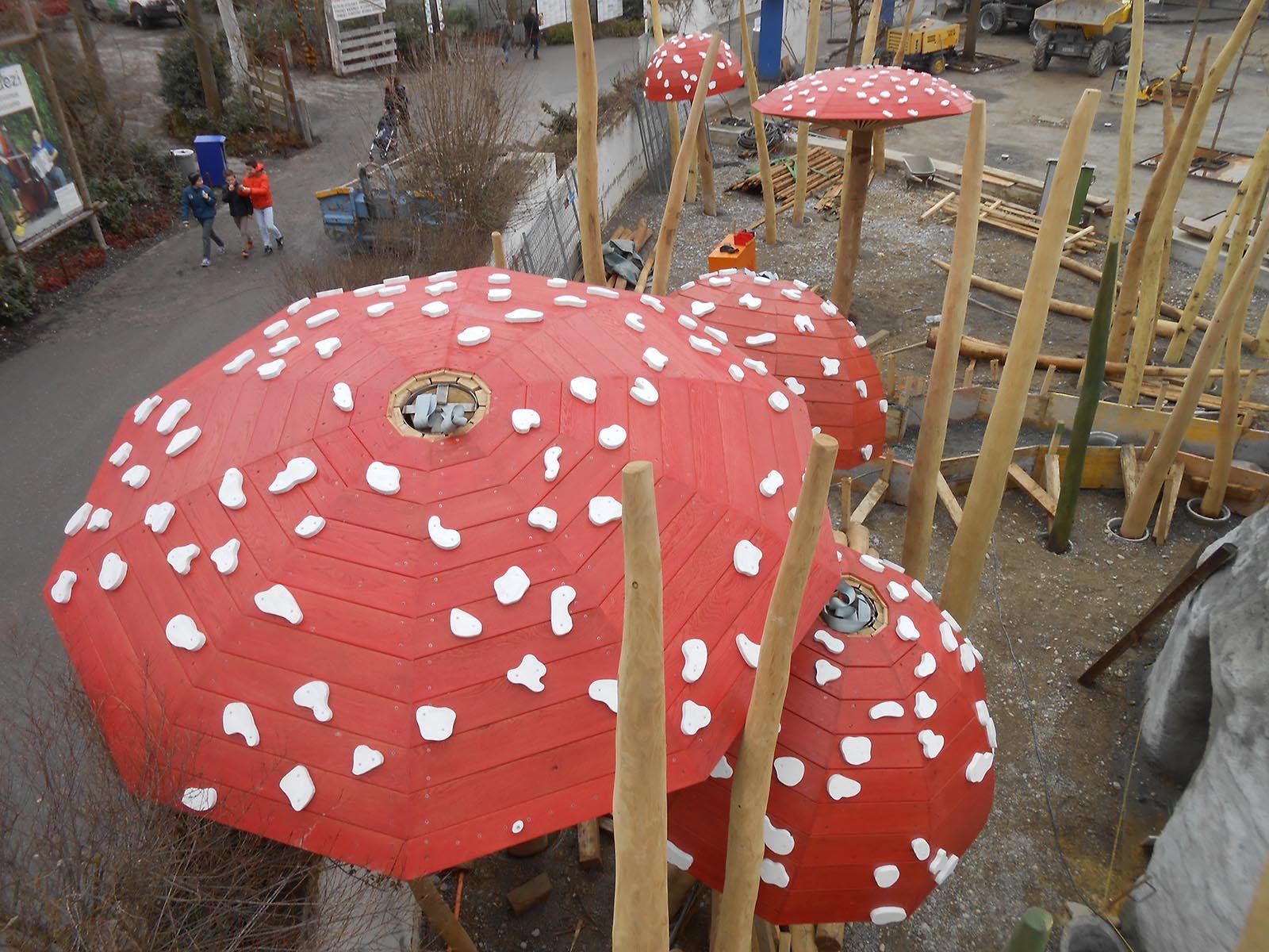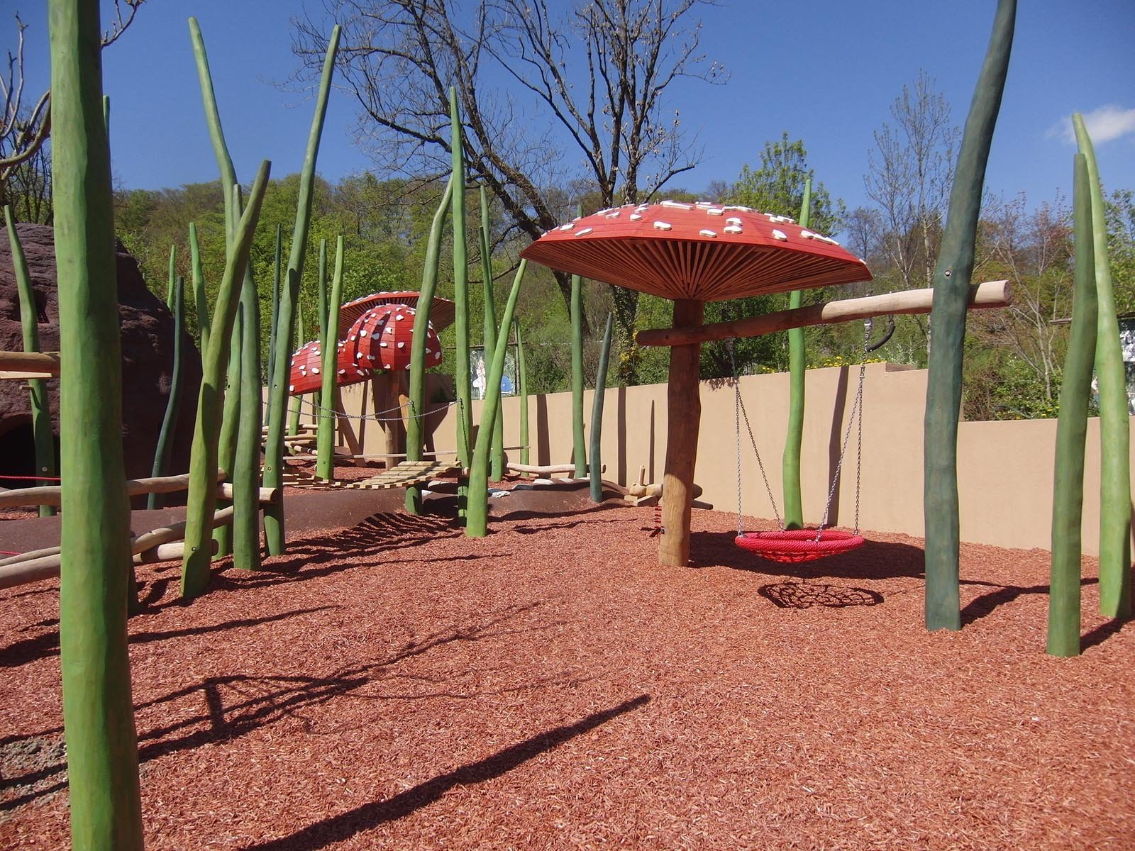beim bau des pantanal-teils des zoos zürich durften wir einen naturnahen, farbigen spielplatz gestalten, der die thematik dieser region in brasililen aufnimmt. von den landschaftsarchitekten wurde das spielplatzthema noch mit zauberwelt umschrieben. wir entschlossen uns, diese vorgaben mit einem termitenhügel aus beton, gräsern aus robinienstämmen und fliegenpilzen zu einem spielplatz zusammenzubringen. die kinder können zwei kletterparcours wählen: einen für die kleinkinder und den hinteren für die grösseren kinder, wobei sich die wege im termitenhügel kreuzen. im termitenhügel gibt es eine höhle mit aufstieg zur rutschbahn und ein durchgang unter der rutsche durch. die in verschiedene grüntönen gehaltenen gräser sind die struktur, an denen wir die spielgeräte aufgehängt haben.