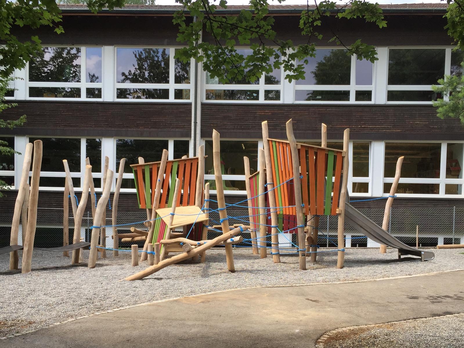 für den hort in der schule „farlifang“ in zumikon bauten wir einen spannenden, architektonischen & farbigen spielplatz. die ineinandergreifende komposition von häuschen, die durch brücken, seilverbindungen und balancierbalken verbunden sind. die so entstehenden innnen- und aussenräume ergeben abwechslungsreiche orte für die kinder mit ganz unterschiedlichen kletterrouten. durch die farbliche gestaltung der häuschen konnten wir im grossen innenhof der schulgebäude einen schönen akzent setzen. als ergänzung für die kleinsten ist ein häuschen als kleiner stall mit zaun und tieren versehen, geeignet für ein interessantes rollenspiel. ein wasserspiel mit matschtisch und rinnen erfreut die kinder in der warmen jahreszeit.